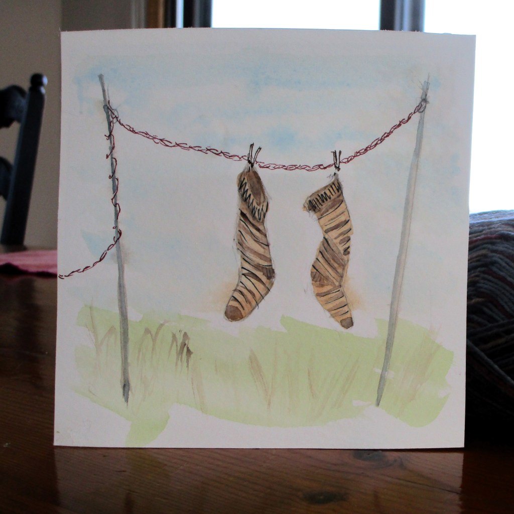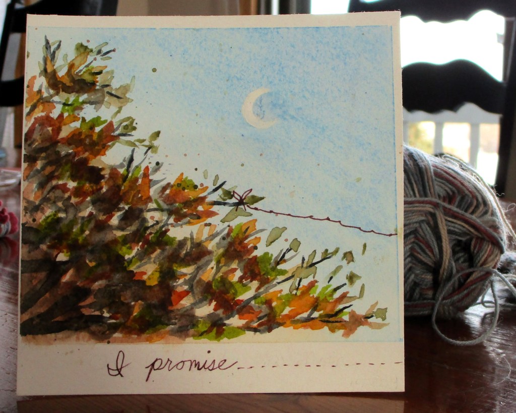 In December I promised Bill that I would knit him a pair of socks. At Christmas, I formalized the promise with this gift, wrapped up with a swatch of the yarn.