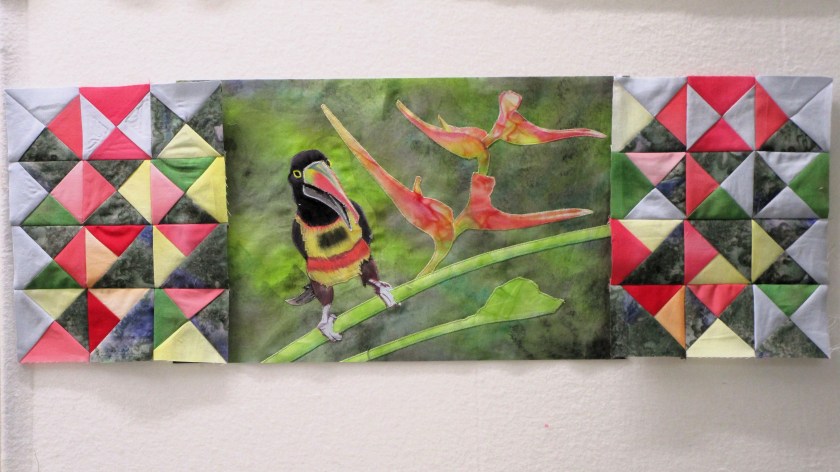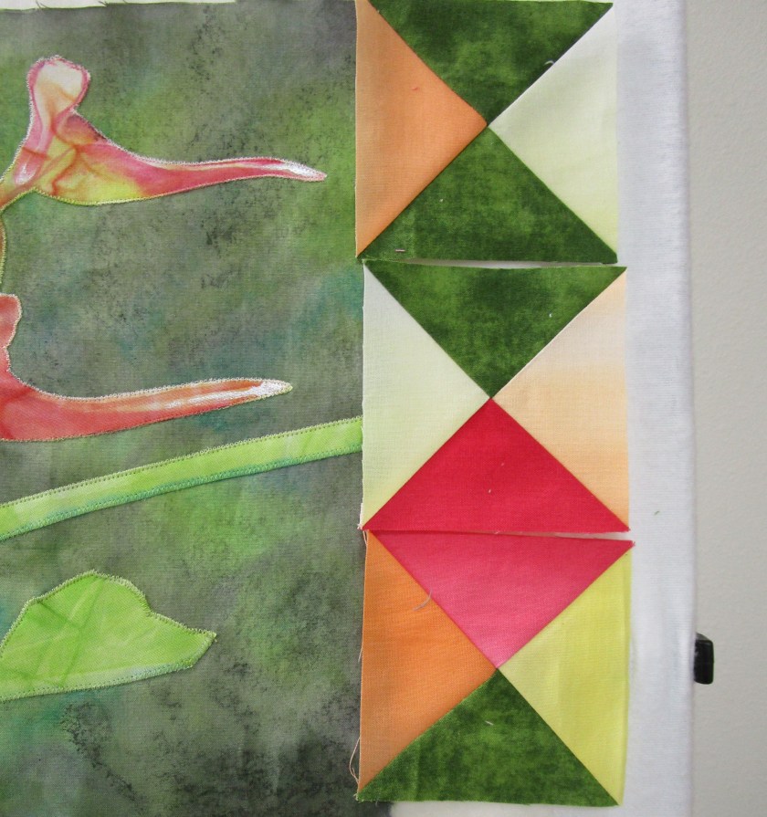 The border just didn’t look like a Costa Rican rain forest. My second attempt used more of the green with the blocks arranged to resemble the ginger flowers of the center block.