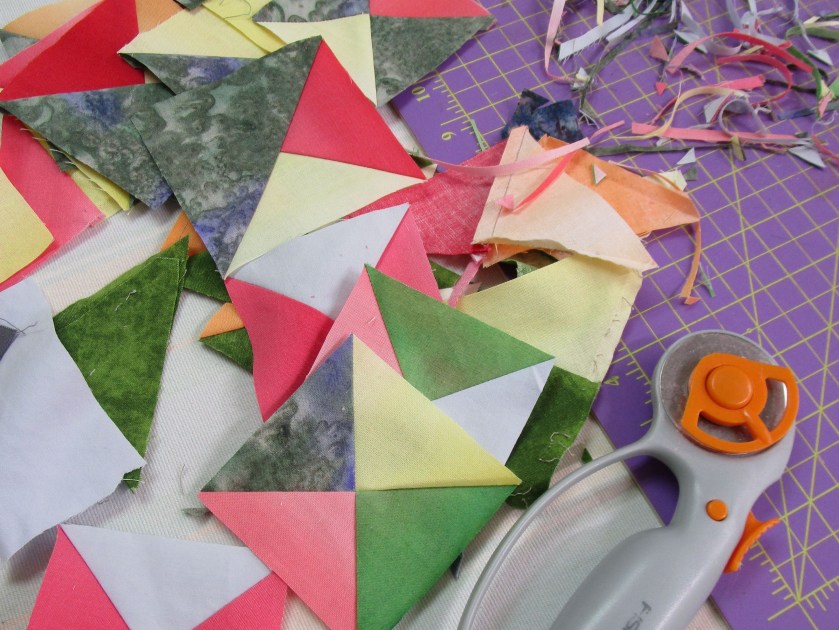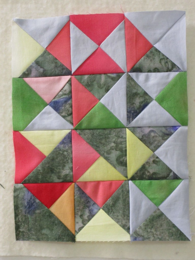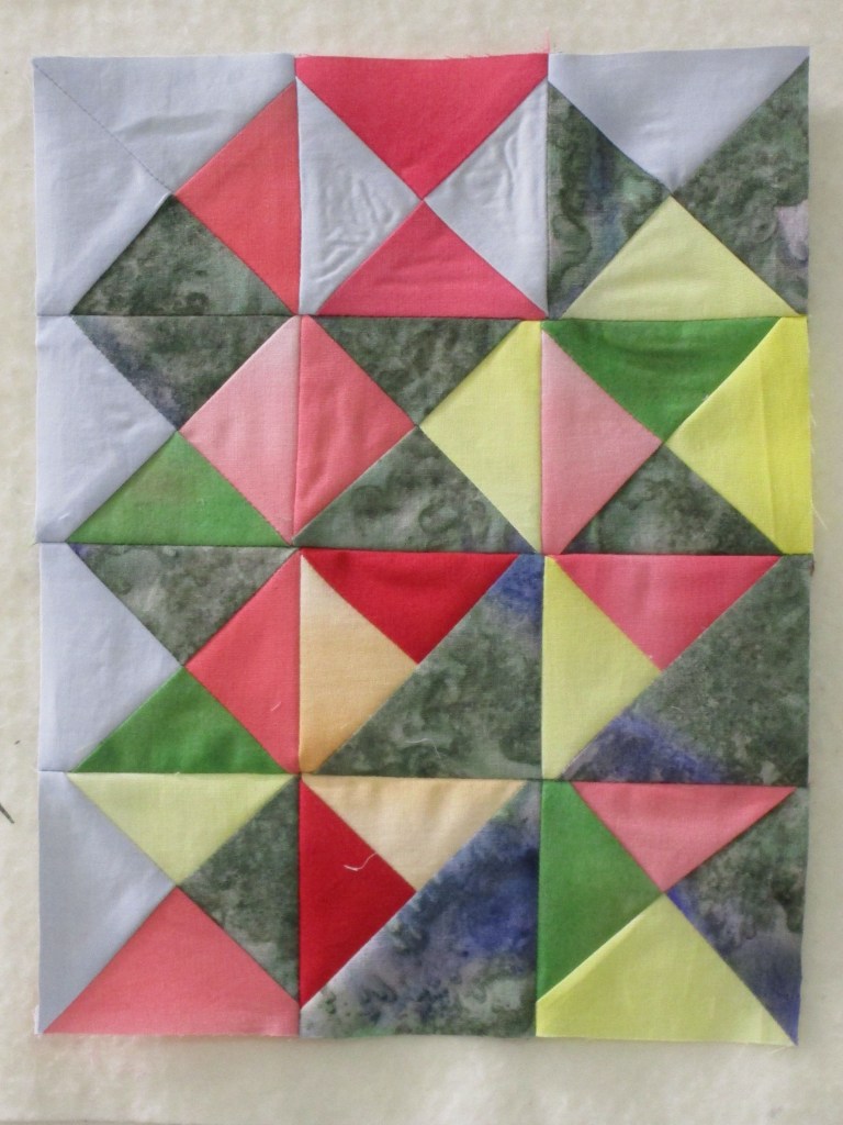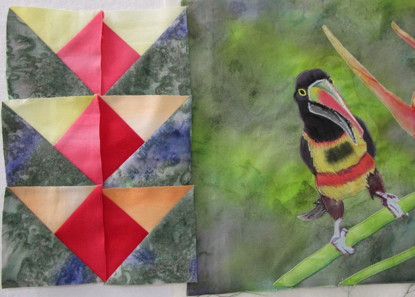 It’s been a week of trial and error, as I struggle to make the first round of blocks suggested by Brenda of Songbird Designs: Hourglass, aka Quarter square triangles. I had come up with a plan for my Costa Rican inspired design and pulled suitable fabrics from my stash.