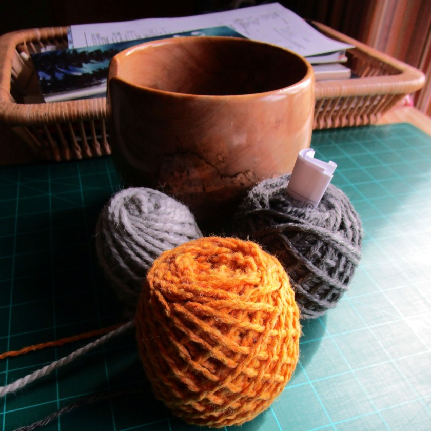 For more than ten years, I have wondered what to do with it. The color is overly rambunctious. It occurred to me that toning it down with neutrals might be the way to go. Hence my choice of Kate Harvie’s pattern, Color Chat – Chunky Version.