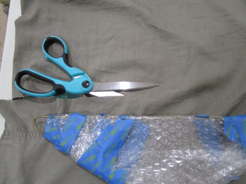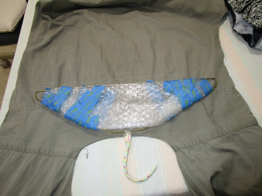 Along with coat hangers, I have bubble wrap (another item that seems to accumulate, especially if your family likes shopping on-line) and a discarded shirt. You will need some masking or painter’s tape, thread, and a little bit of felt. Hopefully, these things are all on hand.