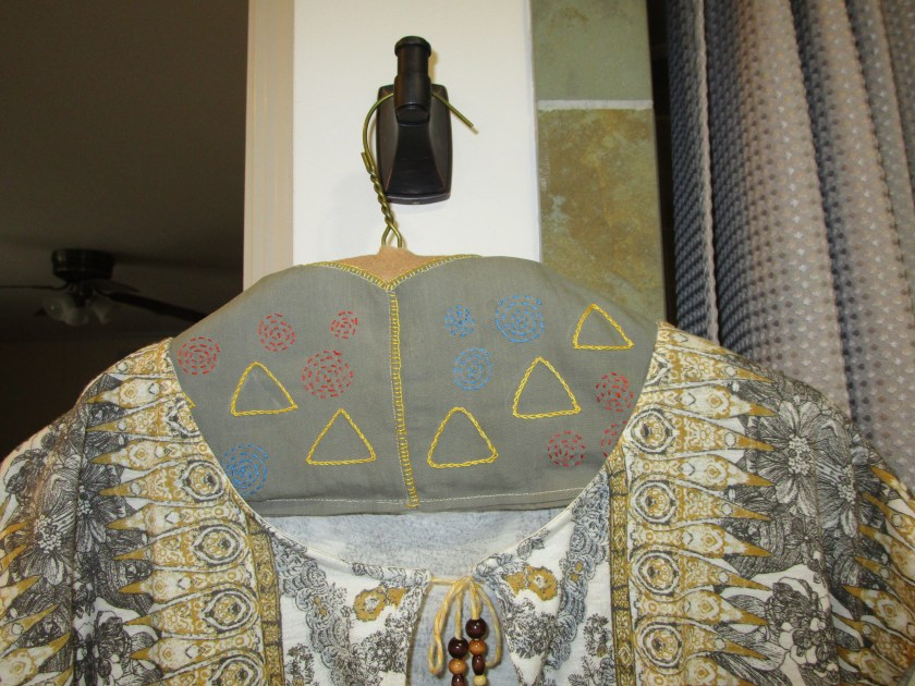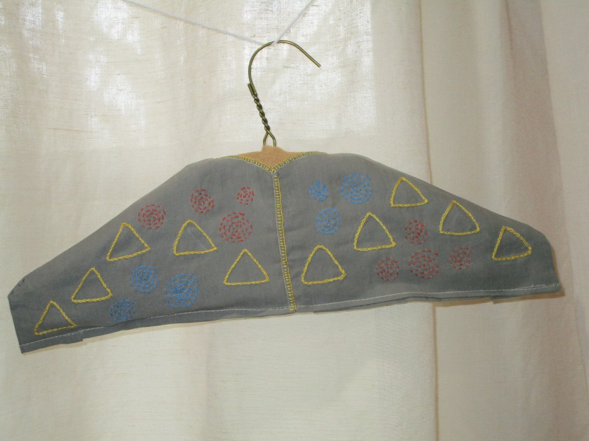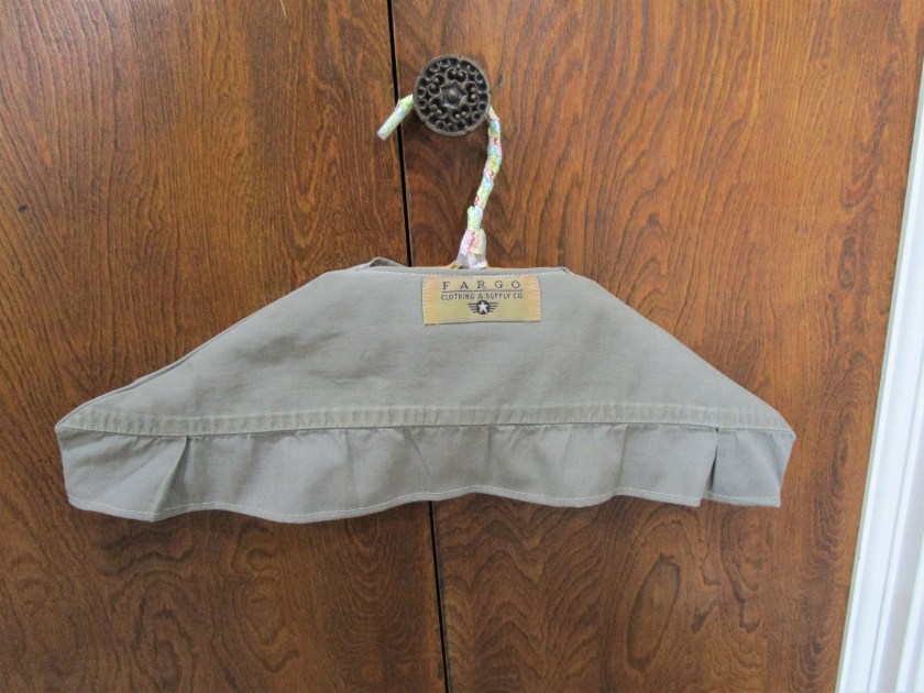 I’m afraid I didn’t get any photos of the sewing-up process – sorry. Basically, you sew the front to back at the shoulders and sides of the hanger, conforming to the hanger’s shape as best as you can. Turn, press and sew under the remaining raw edges – neckline, lower edge, and center front. I inserted a small patch of felt around the area of the hook, because there was no fabric at that location. Here is the back view of the completed cover: