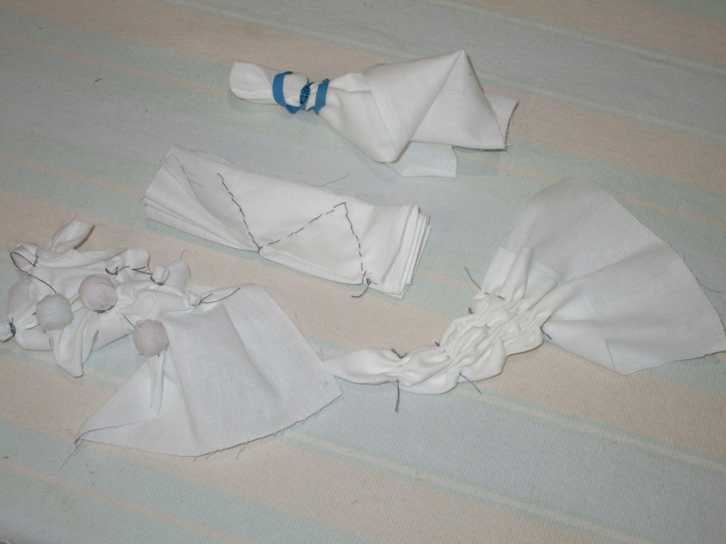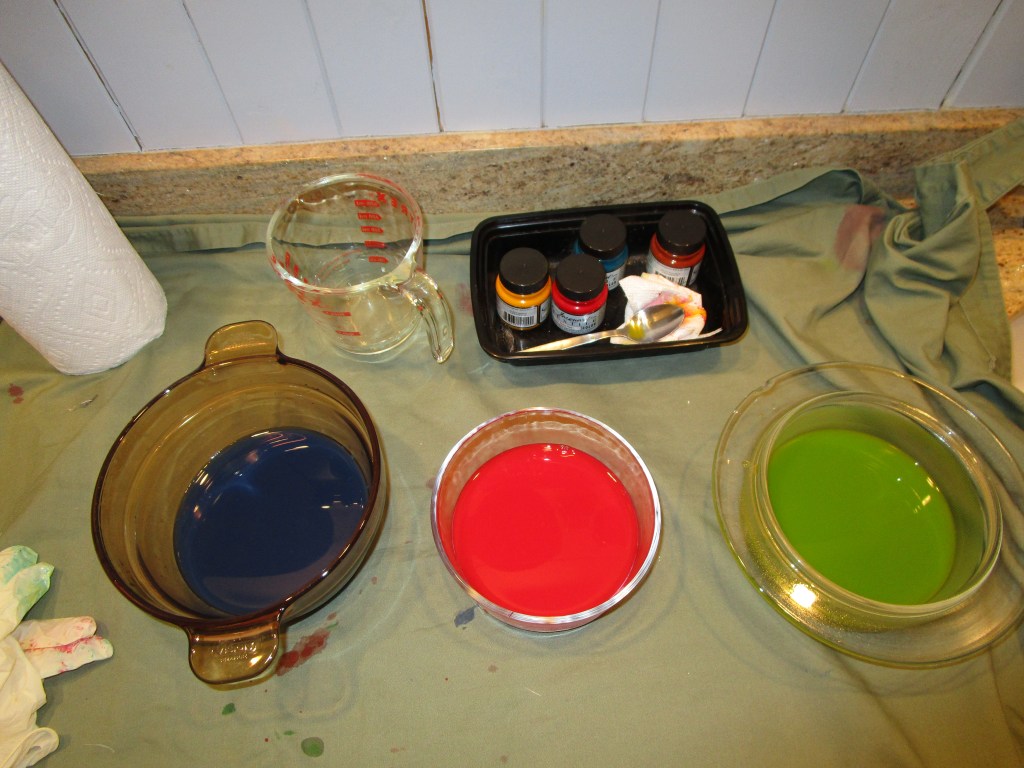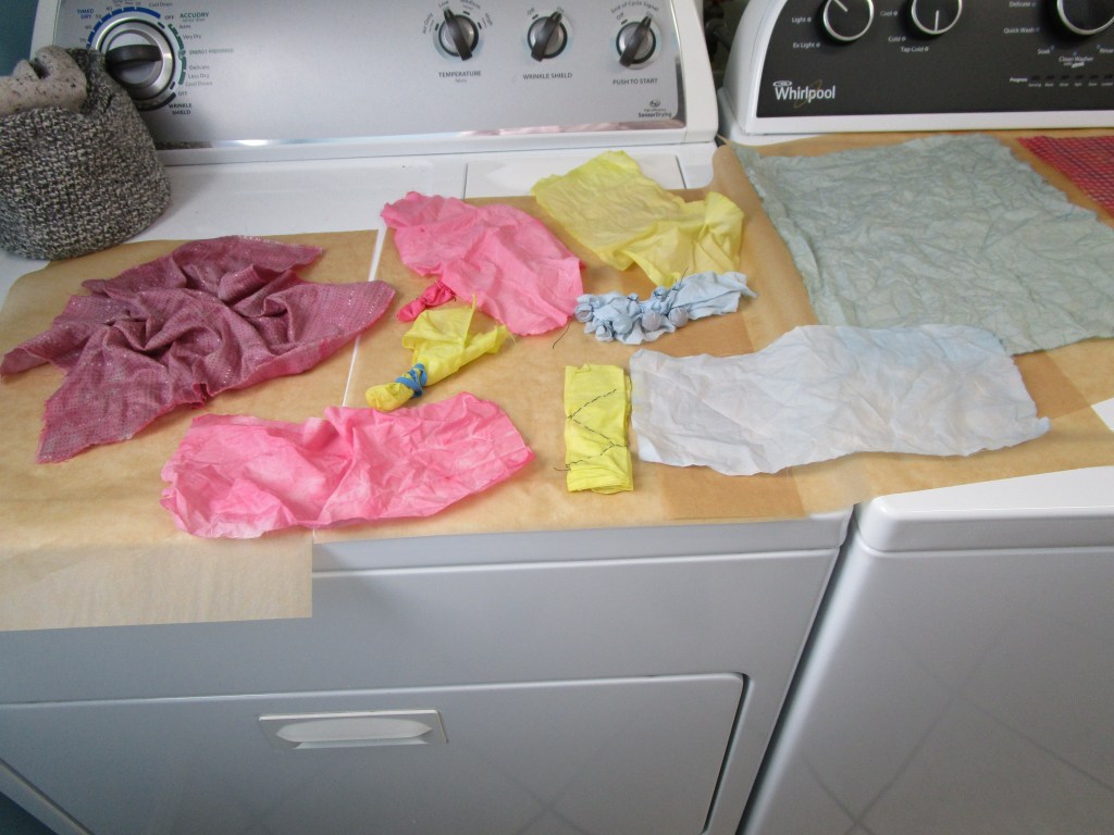 Here you see the dye baths, the baths with the cloths submerged, and the cloths removed and drying. The red paint works best, the yellow second. The blue bath tinted the fabric very lightly. This might have worked better on pre-washed fabric.