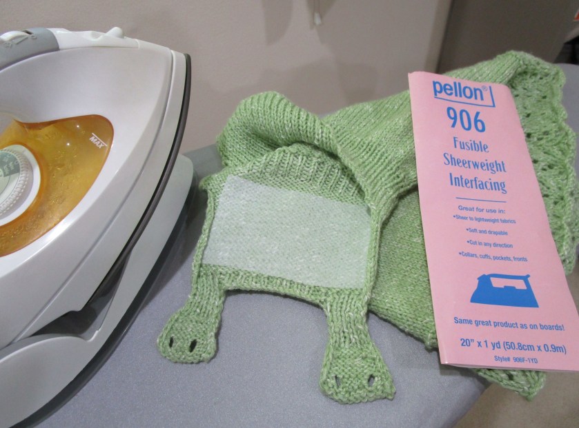 This is a very lightweight version of fusible interfacing. It actually flexes with the knitted fabric. Next I drew a pattern of the moth and pinned it to the dress.