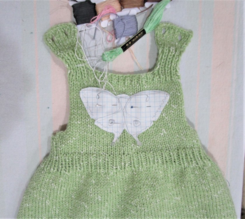 I’m finally getting back to the little knitted baby dress. After I became inspired by the Luna moth in my backyard, I decided to embroider a Luna on the green dress. I had finished knitting it a few weeks ago. Today I completed the embroidery. Here is the Luna moth image which served as my model.