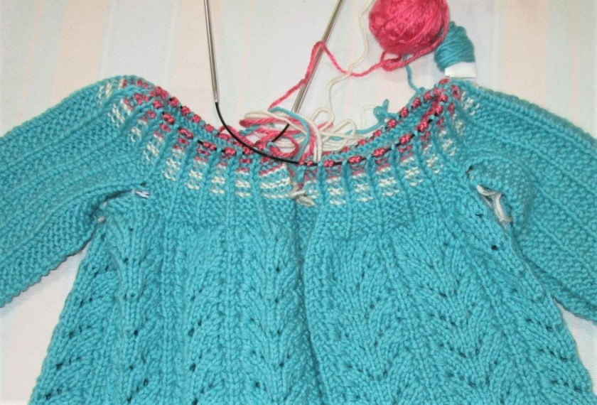 My plan to keep the stockinette stripes evenly spaced worked out well. As I began to run out of yarn I added the white and pink stripes. The blue ribs were carried through by slipping those stitches in the white and pink stripes.