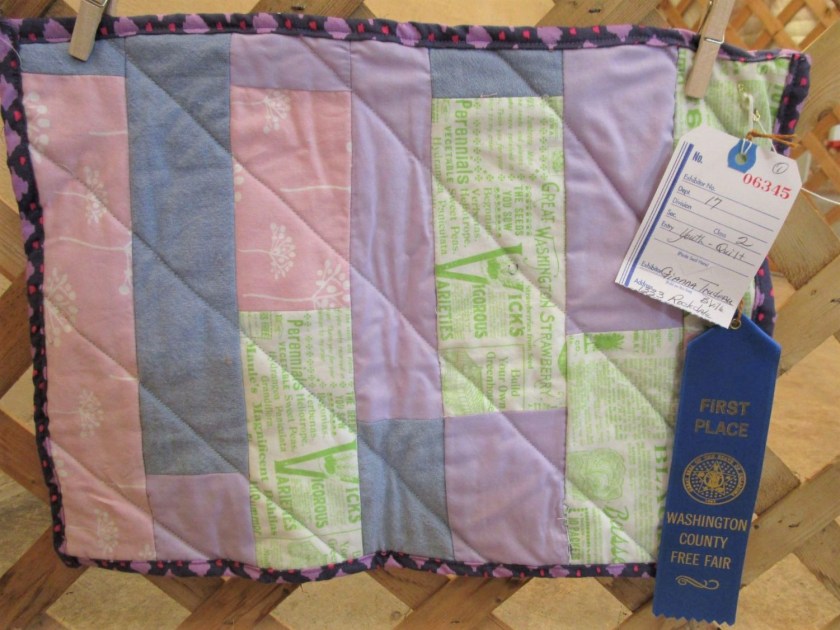 But I was very pleased to see that some of my fiber arts kids had entered items that they made during our class last year. Here is Gianna’s Blue-Ribbon strip quilt.