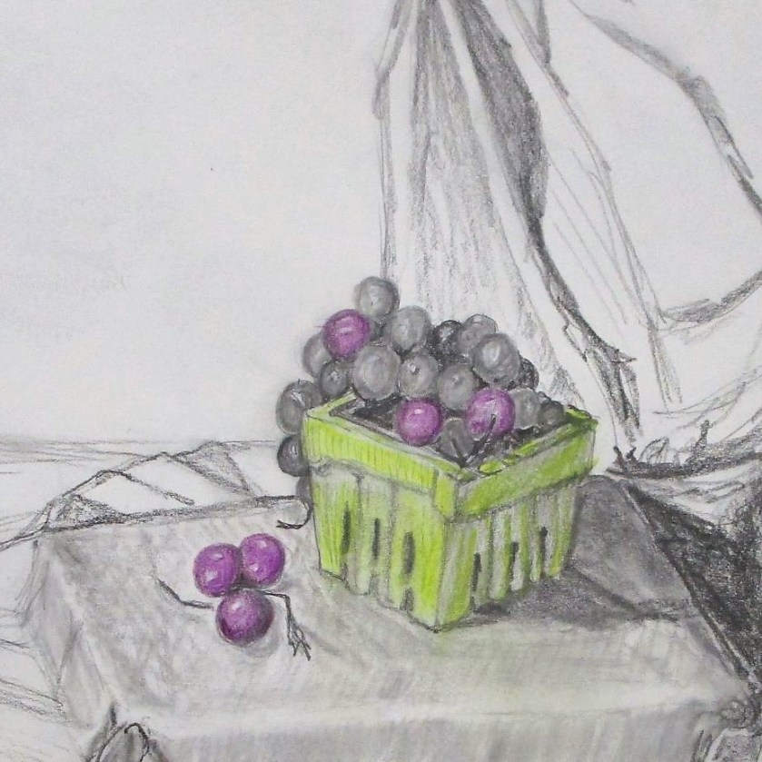 This past week, I completed a 4-week drawing class. The final lesson involved sketching from life. This is my rendering of a pint of grapes sitting on a book with drapery over top and in the backdrop.