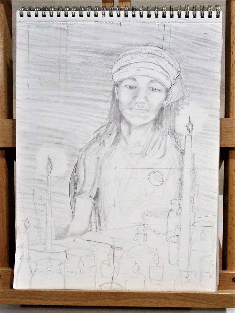 This is a preliminary sketch from a photograph I took of Henry on his birthday in November. Instead of having a cake with candles, he wanted to scatter the candles across the whole table. I managed to catch his face in an expression both solemn and thoughtful.