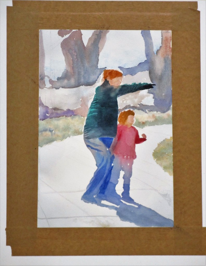 UNFINISHED. I transferred the figures, laid down the first washes and one layer of second wash. I like where I’m going but feel the need to develop the painting slowly.