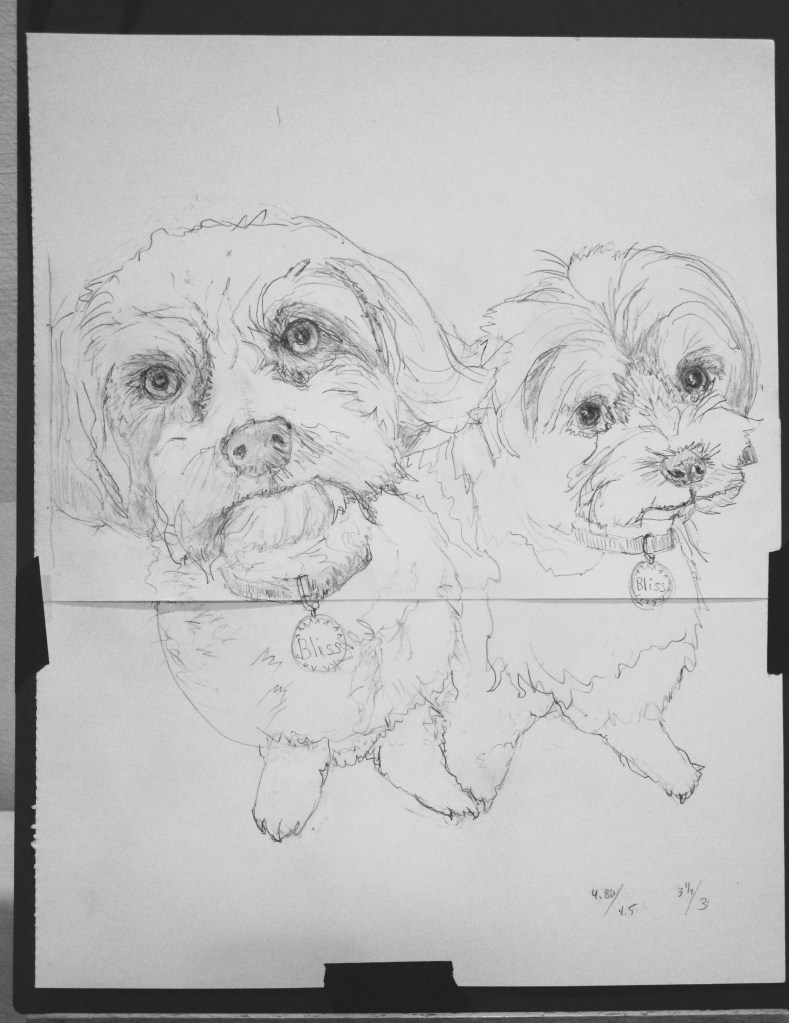 I know these dogs well. They are present at yoga session and form a 2-dog greeting party with the arrival of each student. My challenge will be to render their personalities as vividly as possible.