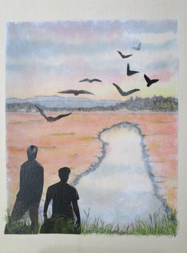 Two days later, after both sides had dried, I completed the maneuver: Using two long cable needles, pick up stitches at each center back edge. Align the two edges right sides facing. With a third (short) needle knit together a stitch from each needle. Repeat. Pull first stitch up and over second stitch. Do this until all stitches are worked into the bind off.