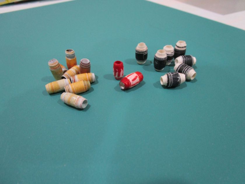 The yellow beads are rolled-up magazines. The red beads are basic copy paper colored with a red Sharpie. The black and cream-color beads are made with copy paper and then a strip of narrower magazine paper. This is the style I like the best. It has a nice barrel shape and a slight shine from the black magazine paper. I made more beads of this style in prettier colors: