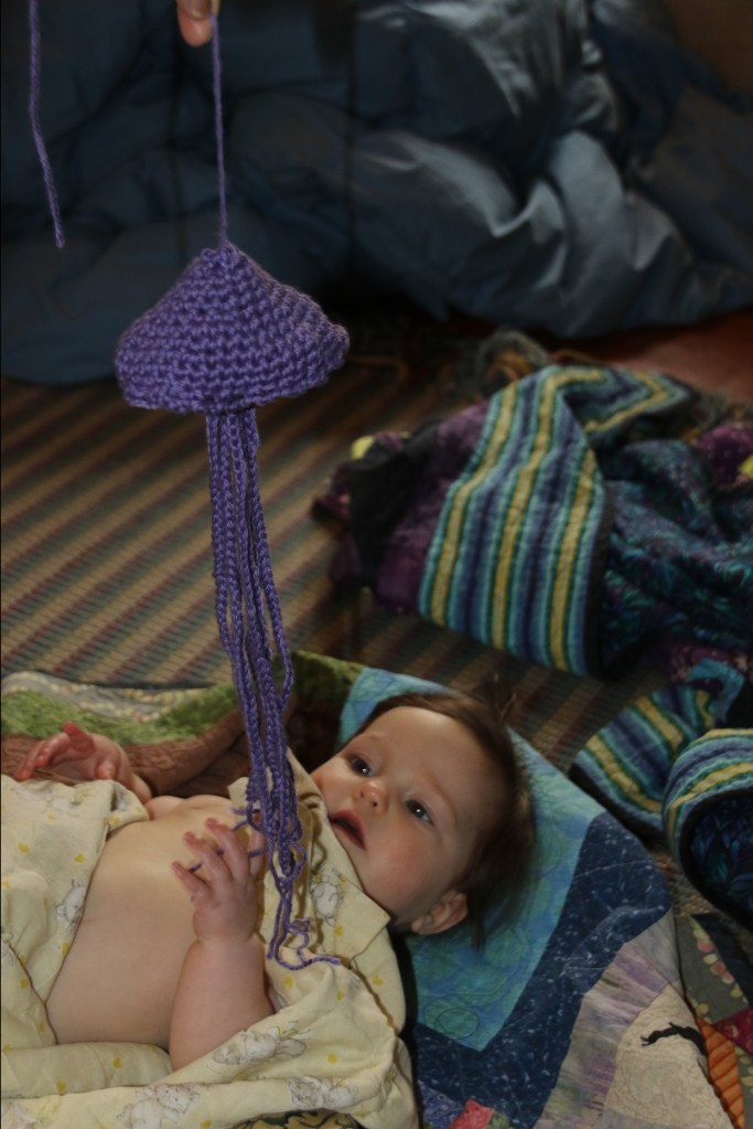 I have been planning to crochet a small number of sea creatures, with the idea of making a tableau called “Under the Sea.” I decided to start with a jellyfish. Jellyfish are abundant in the world’s seas. They are a significant food source for Loggerhead and Ridley sea turtles. They are also very easy to crochet. Since I am currently immersed in baby-care activities, quick and easy is my choice for today’s fiber object. Here is what I came up with, using an H hook and purple cotton yarn: