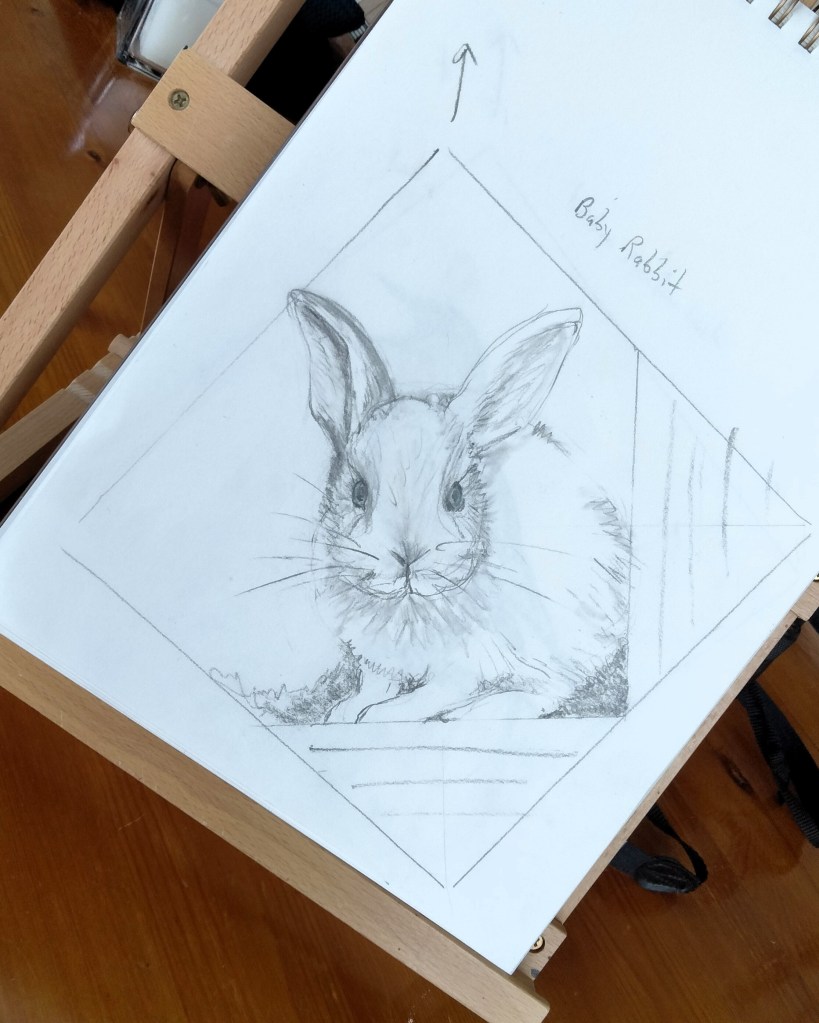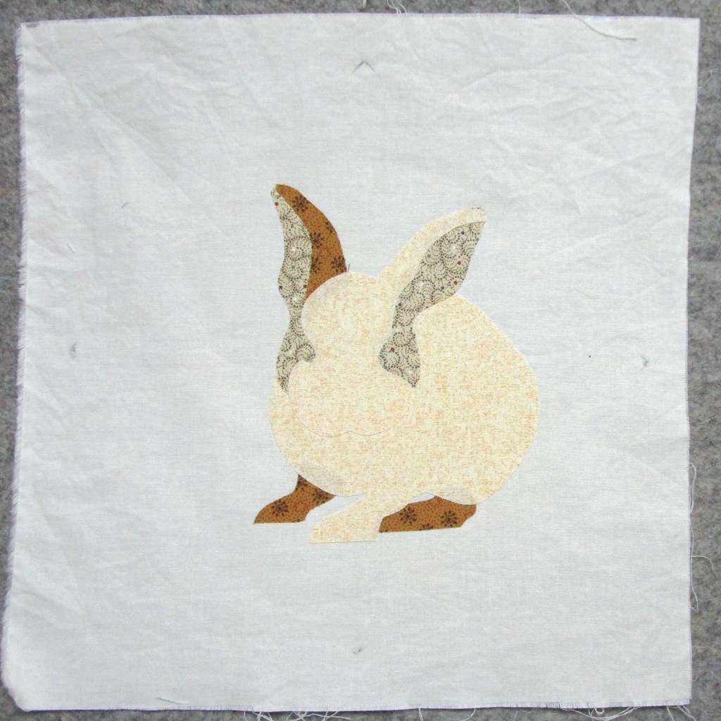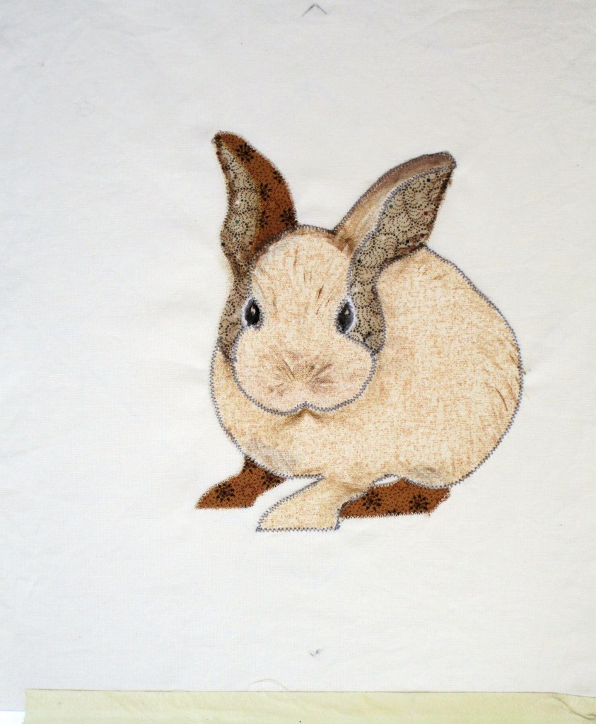 Some additional remarks about the rabbit: The original photo was of a hybrid rabbit – white fur and brown patches, pale blue eyes. I’ve been observing many wild rabbits that hop about the garden here in my new home. Their coloration is more earthy and the eyes appear jet black. So that is how I made this rabbit. Also, the poor bunny has no nose or mouth yet. Those details will be added with embroidery floss. And maybe a few whiskers to boot.