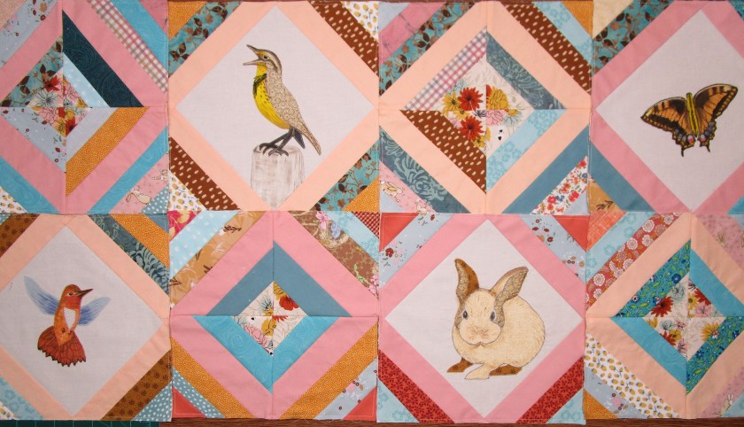 This week was moderately productive. I finished several more blocks for the Oregon Baby quilt, including two feature blocks. There are now four features finished, except for any finishing embroidery touches.
