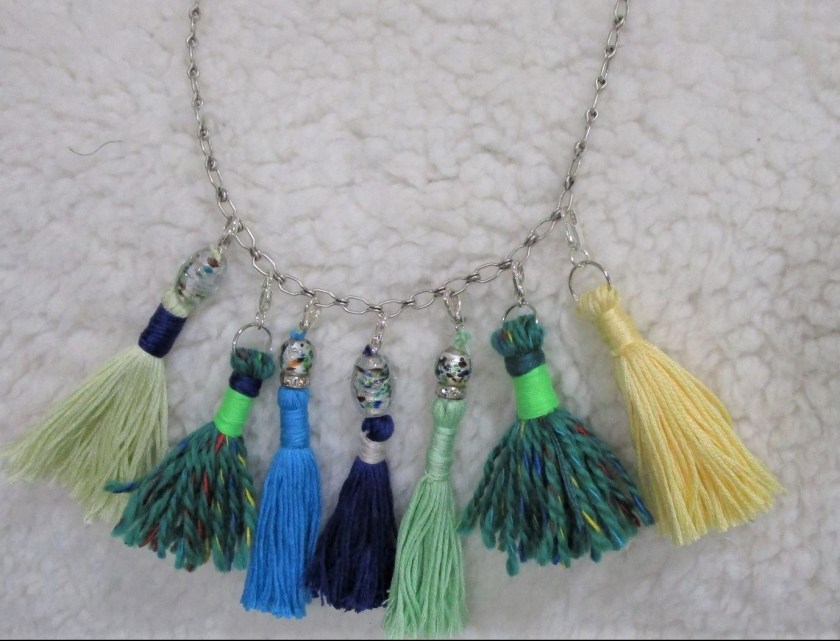 Trim tassel ends to length desired and you’re done! Here is my finished necklace. I spent less than $10, including the chain.