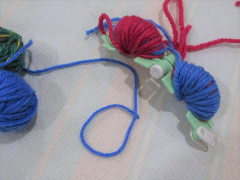 After a quick trip to U-Tube – source of every craft technique in the world – I discovered that the yarn needs to be wound until the holder’s center is filled completely. Then, when the holder is closed and the yarn cut, compression keeps the cut bits together long enough until they can be tied up with a piece of yarn.