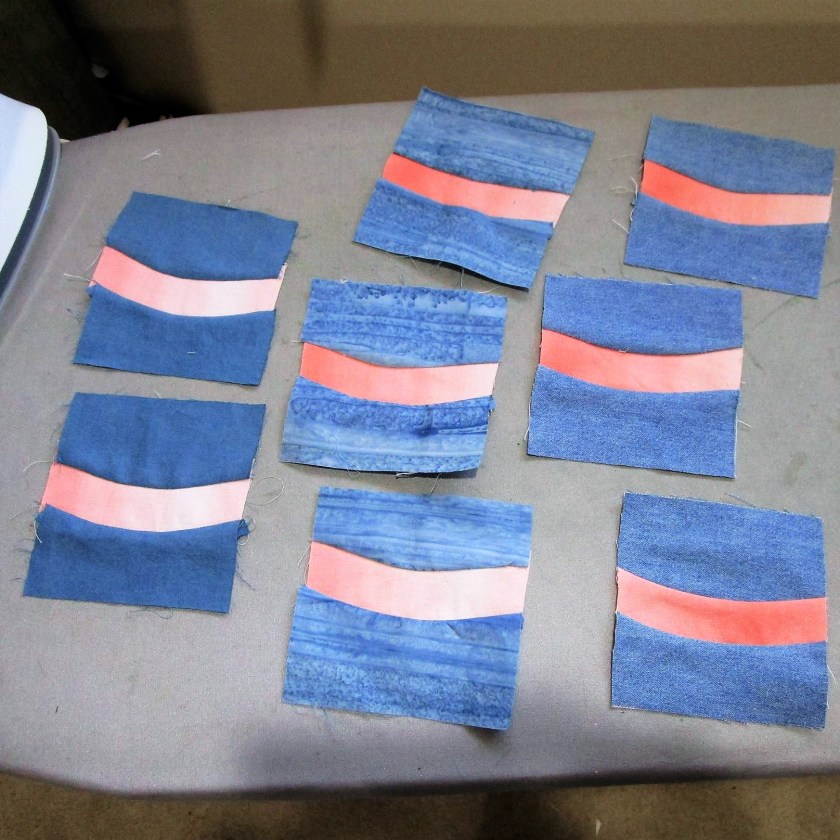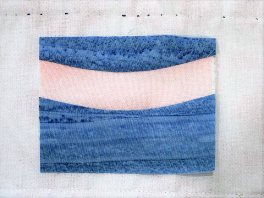 Fabric selection included bits of three men’s shirts. (The dark red and dark green strips, and the blue chambray behind the first circle.) All three of these fabrics had been worked into the Shell Lake Story quilt. So, I am using scraps of scraps!