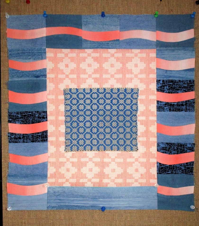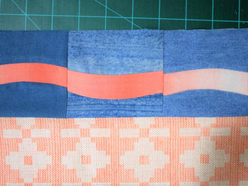 Having recently finished a wall quilt, I found myself with various pieces of fabrics left over. Instead of stuffing them into a box and shoving the box under a bed, I decided to cut the fabric into strips for the purpose of sewing them into a project bag.