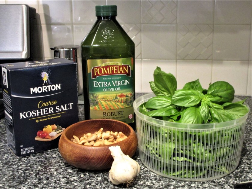 After washing and spin-drying the basil leaves, I got out my well-used recipe for this delicacy. It’s from a collection published by my herb club friends in Plano, TX. This version was submitted by Gladys Denham. Begin with these items.
