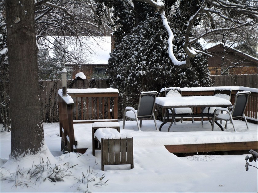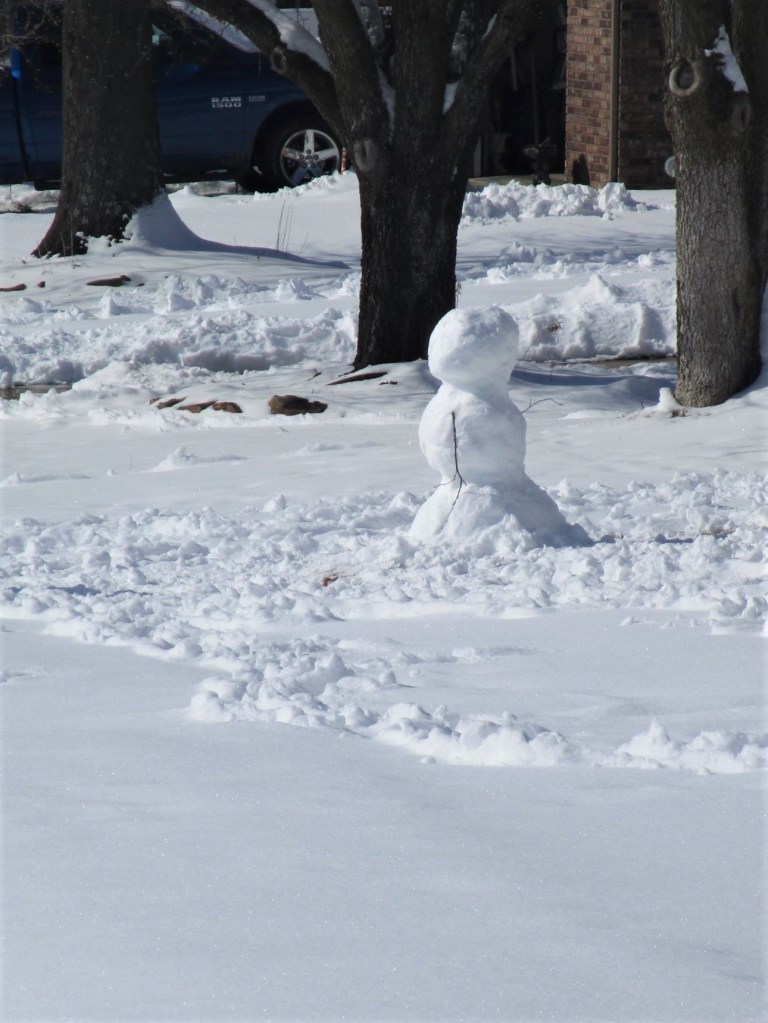 Backyard vista. Bill estimated the total snow accumulation at seven inchesNeighborhood streetBundled up, including Wellies.A lone snow person stands on guard.Magnificent pecan tree holding its own against the snowRosemary bush, whose winter blossoms were rudely interrupted. Her fate is uncertain.