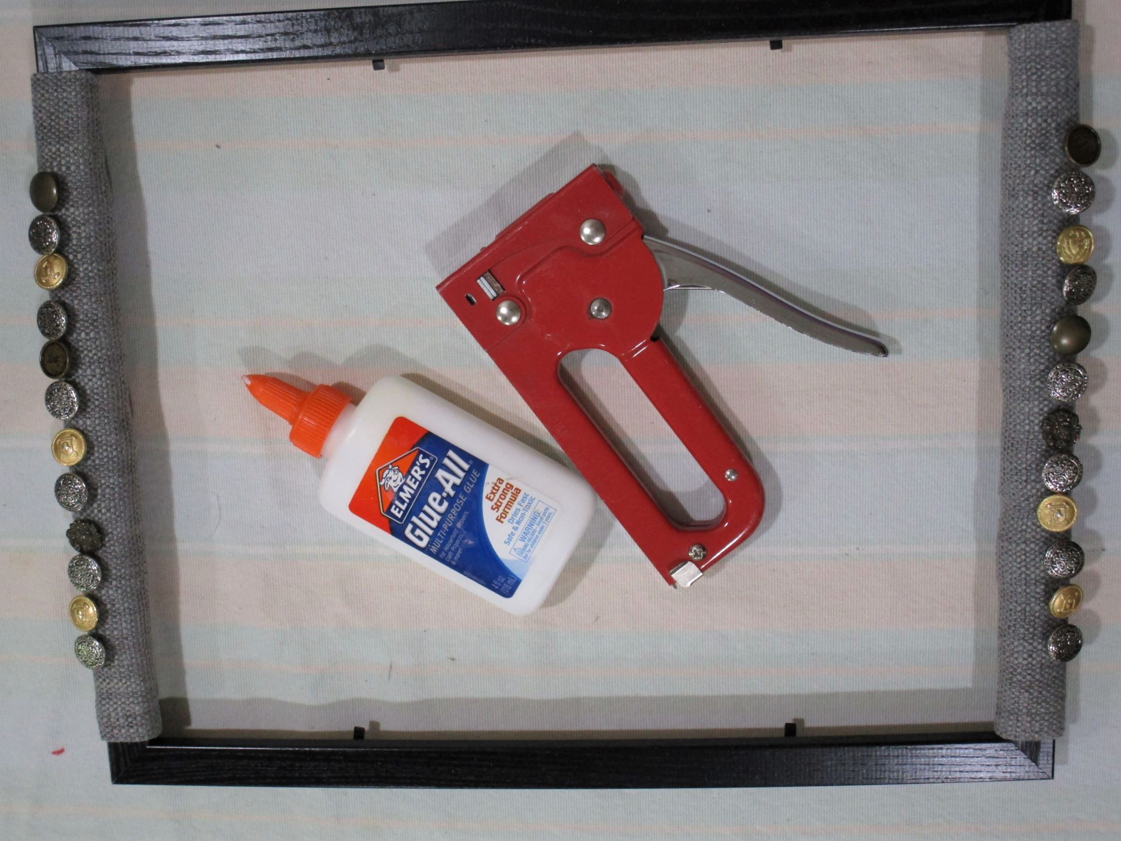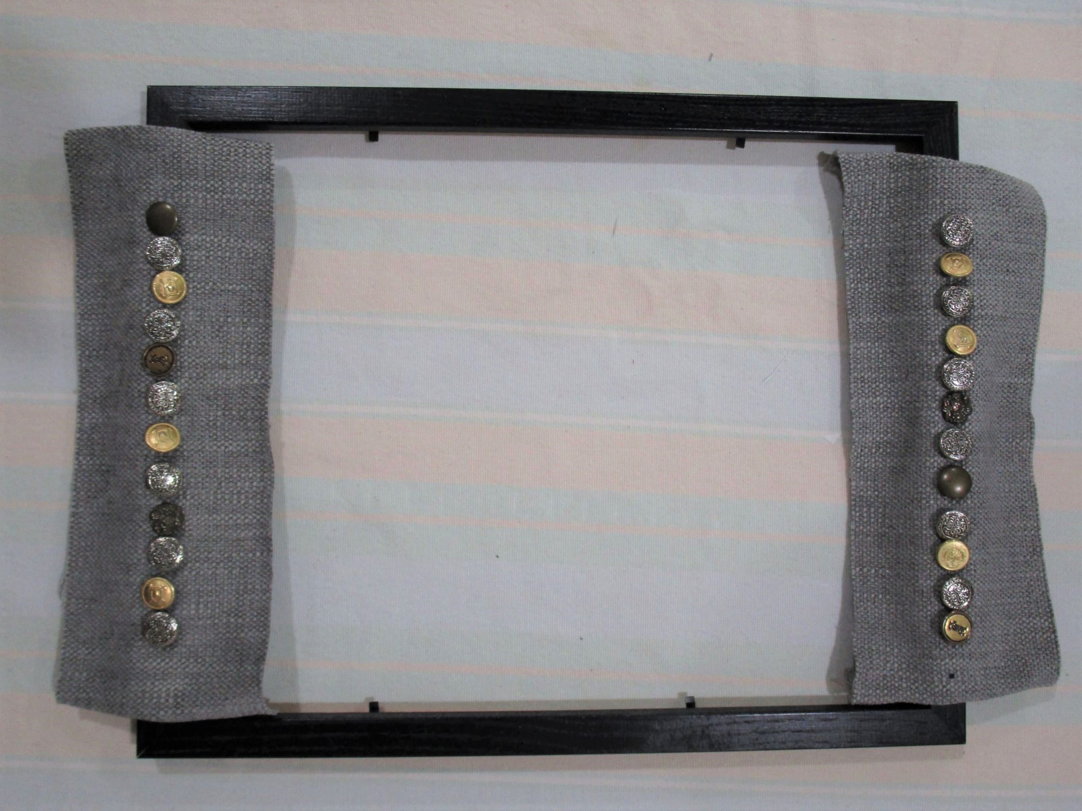 The button-covered fabric rectangles were wrapped around the short sides of the black frame and stapled in place. I used the glue to prevent fraying.