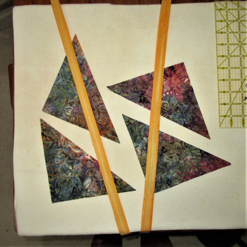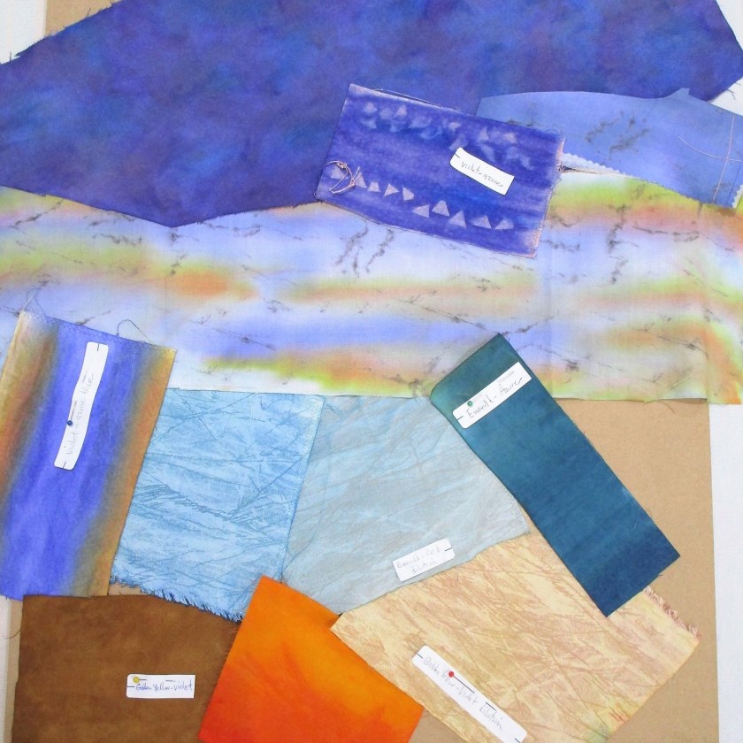 Here’s the part all fiber artists (including myself) find extremely creative: choosing fabrics. Since I like to use watercolor, I painted my swatches. After assigning a hue and value to each segment on my pattern, I picked out the fabrics to best achieve my color scheme of orange, blue-purple and blue-green.