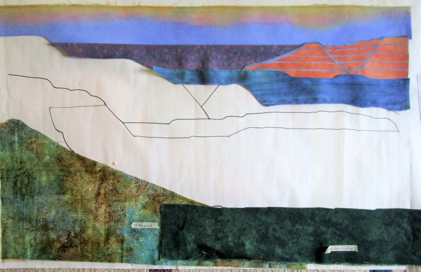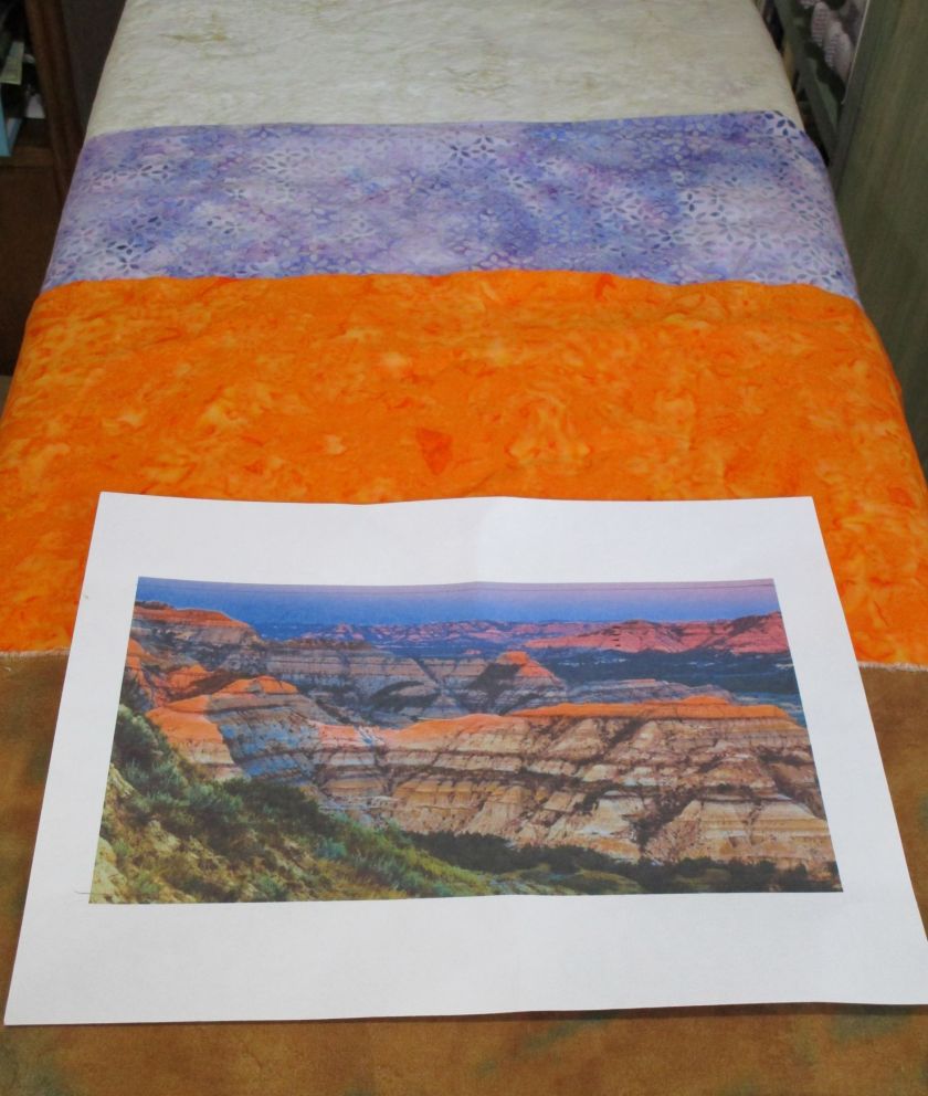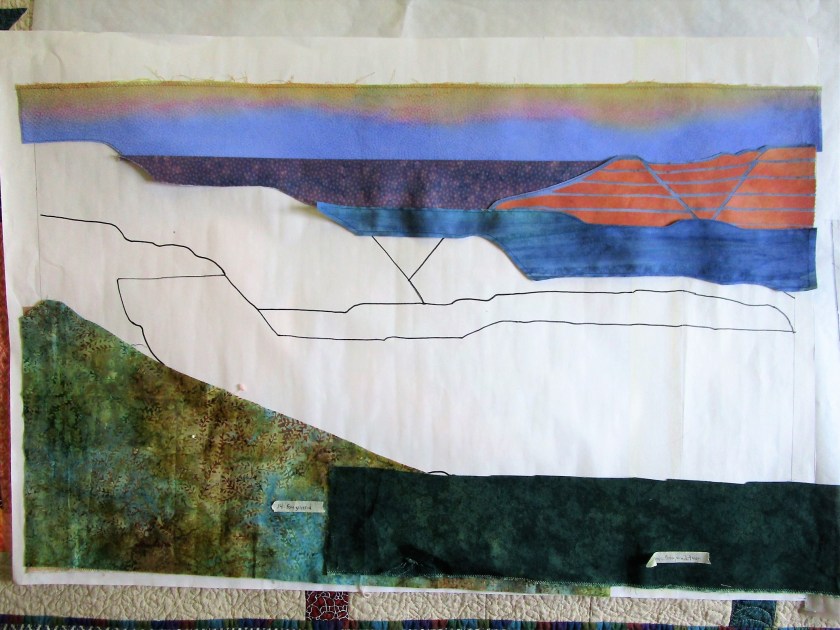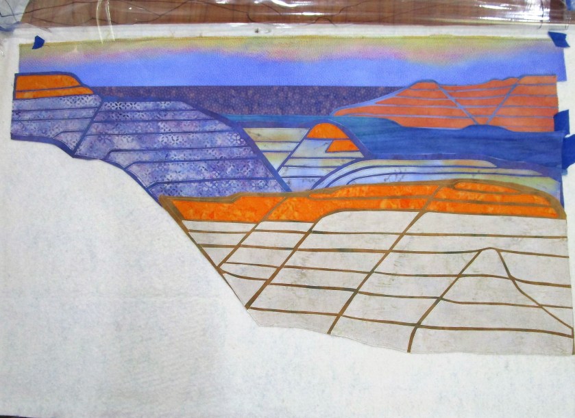 Here’s an aside about the fabric I chose. Ultimately, I couldn’t find fabrics that had the colors and textures that I needed. To get there, I painted on printed fabric for most parts of the quilt. I also selected a few batik prints that were close enough, with only minor adjustments to color.