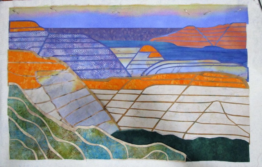 The inspiration for this art quilt came to me during our trip to Roosevelt National Park in July of 2021. I was captivated by the sandwich layering of rock, running in parallel lines that eroded down over thousands of years. It suggested to me a string pieced quilt. For the next several months I thought about my concept and puzzled over how I could bring it to life in fabric.