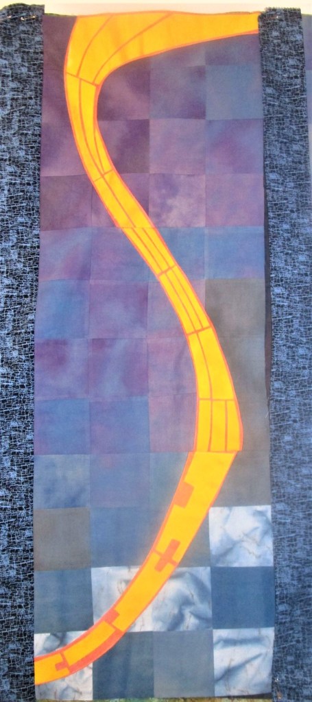 I was so glad that Anja chose the prompt of Curves for the first round of this year’s Round Robin quilt along. In working with the vintage weavings chosen for my center block, I had observed that the maker had used lots of curved lines in her color patterns. Some were vine-like, some looked like hairpins and some are just little wriggles. I was keen to echo these curves in the quilt as I built it.