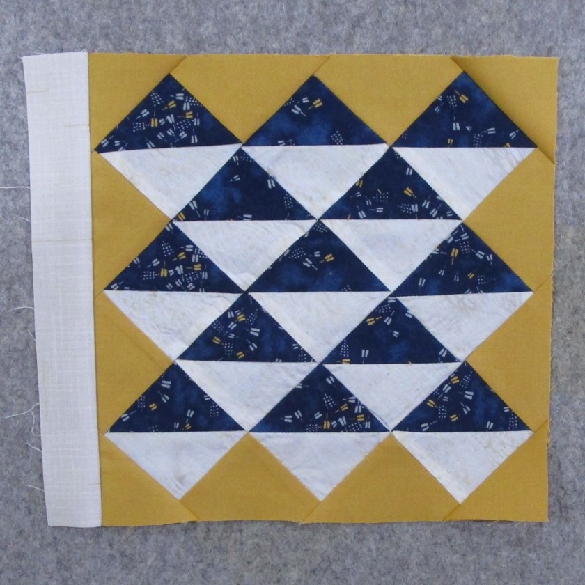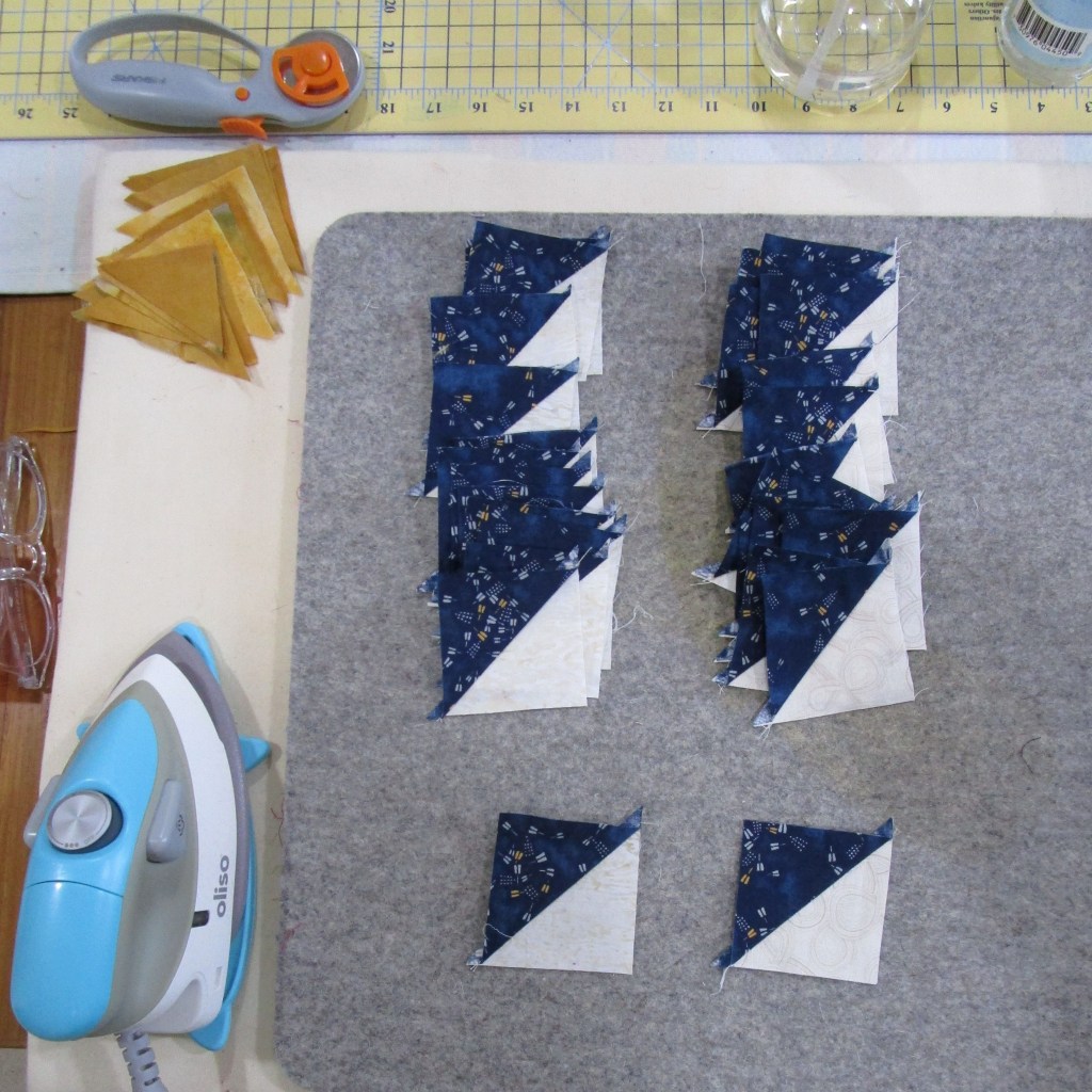 After cutting, I shoved the strips into four baggies: Solids, lights, mediums and darks. My plan is to alternate the strips, not so much by color as by value. Forging ahead, I completed the first block, which is assembled from four strip-pieced squares.