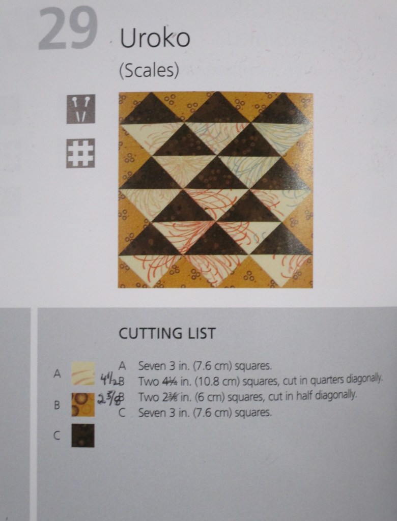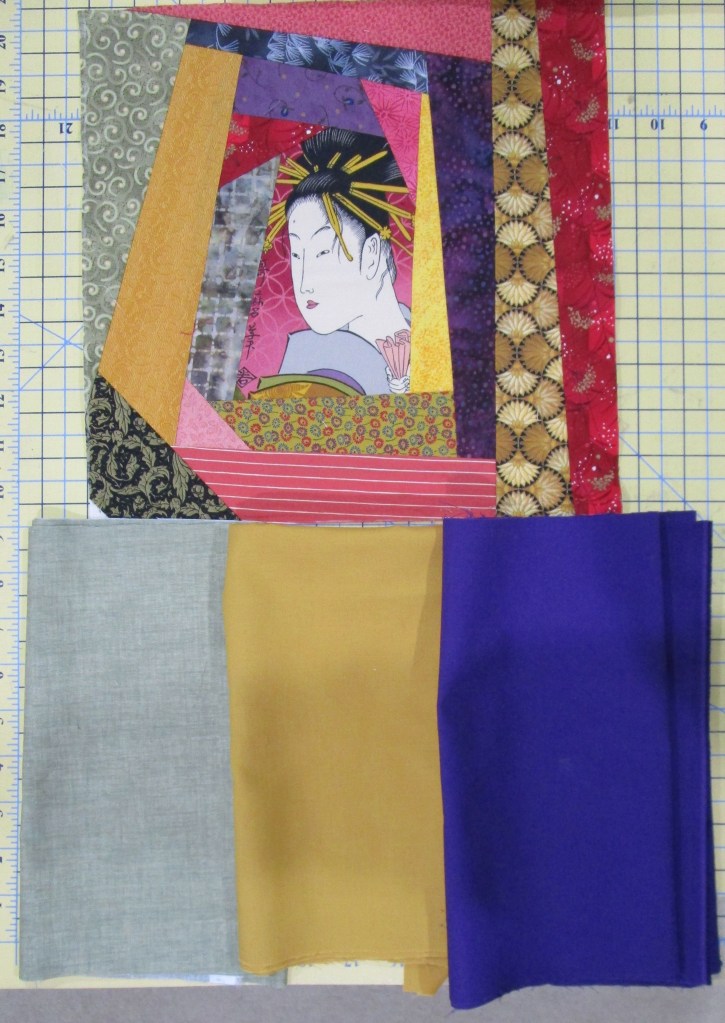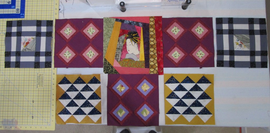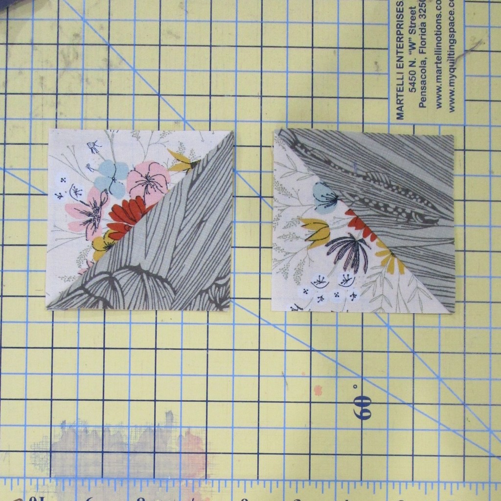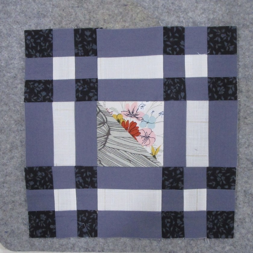 The solid 2 inch strips (In this block, the pink strips) will be placed consistently at the widest point on each square. I chose a brightly colored floral fabric to act as a mini focus point for the block. These two elements should serve to unify the multitude of fabrics that will be used in this quilt.