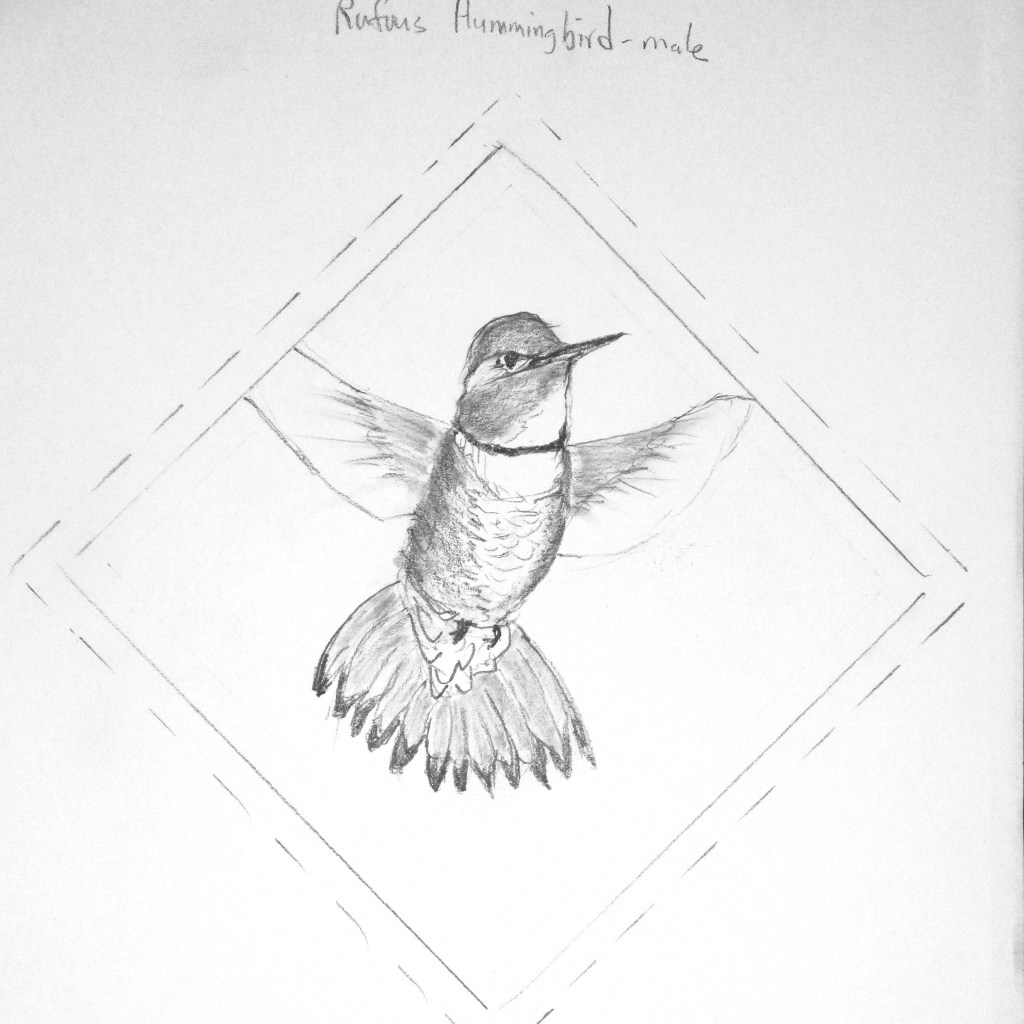 Moving on to the first feature block: I chose the rufous hummingbird. After making a pattern from my sketch onto tracing paper, I cut out the parts to be appliqued and fused them in place onto background fabric.