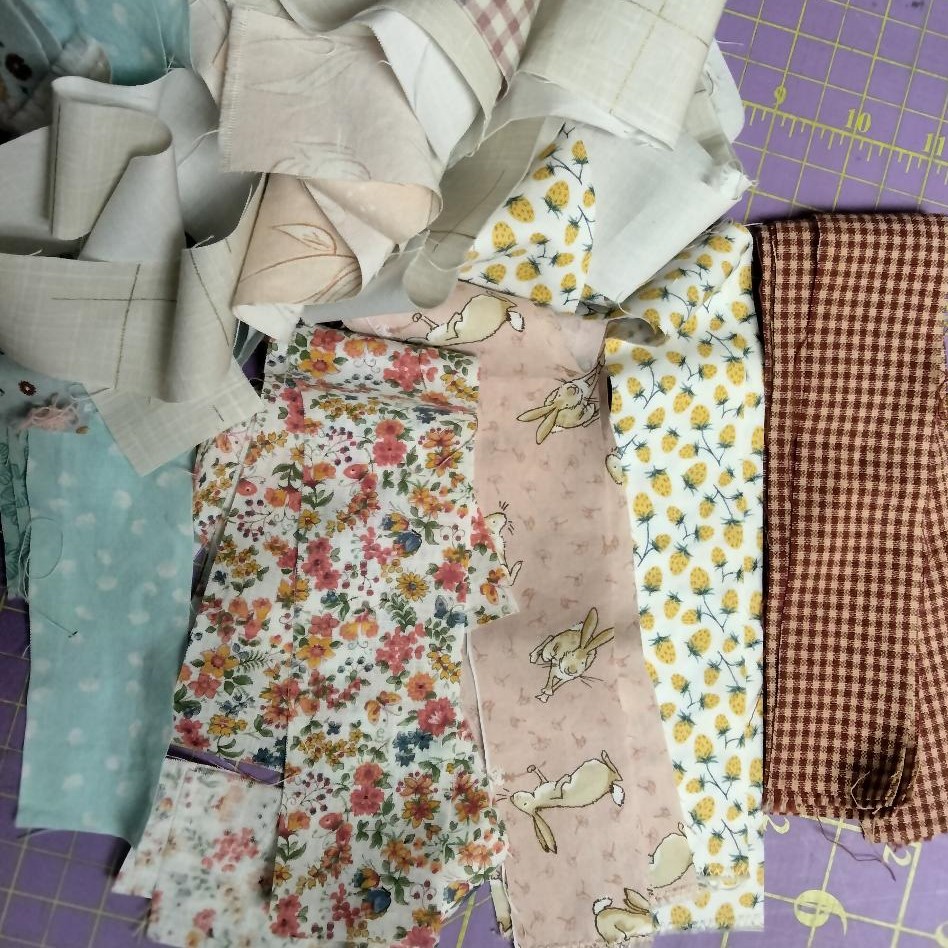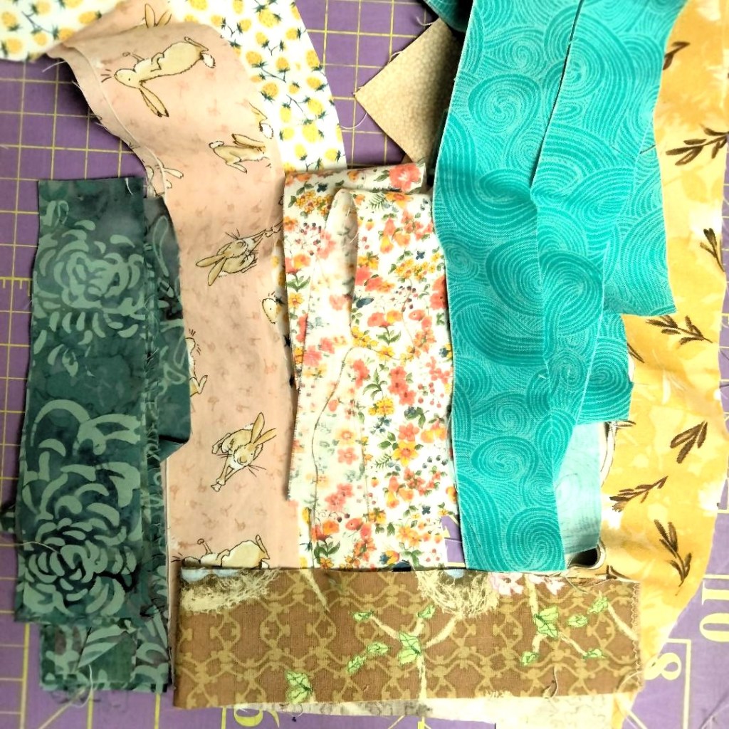 Having received a lovely bundle of fabrics from Connecting Threads, I have proceeded to cutting and sewing. Here are a couple of images of strips. They are not cut precisely, but range from 1 1/4 to 2 inches in width.