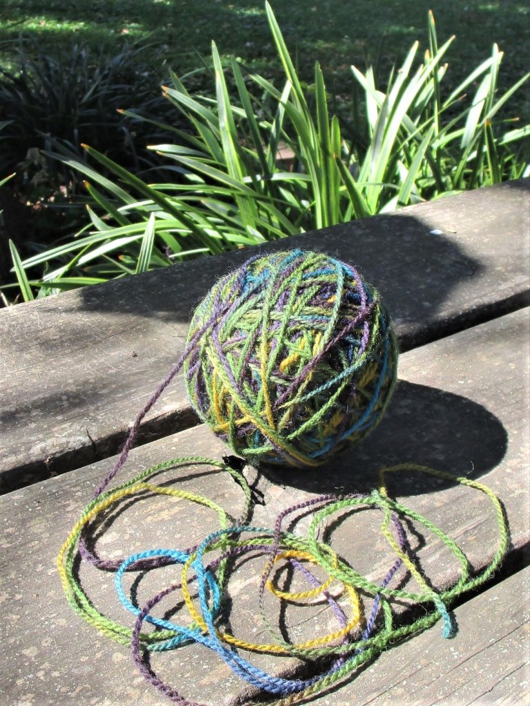 The yarn was displayed in groups by weight. I focused on the fingering weight. It was made from the wool of the Tunis breed. As expected in a natural yarn, it was a bit scratchy. I chose the colorway Peacock and Turquoise. It has short color repeats.