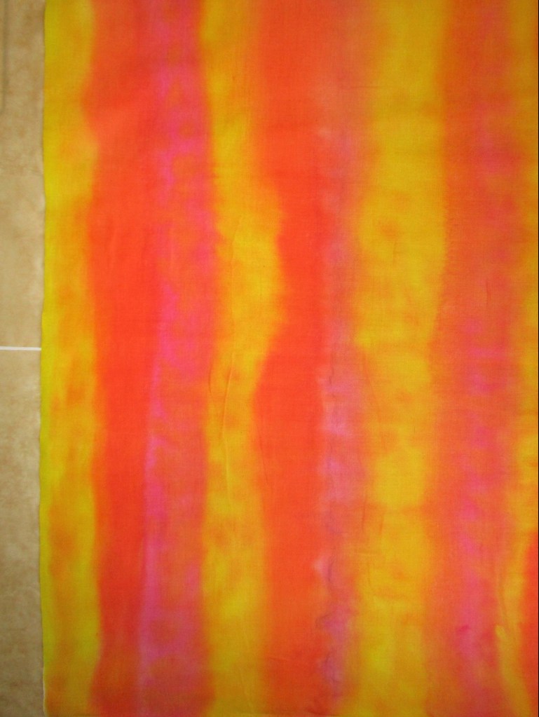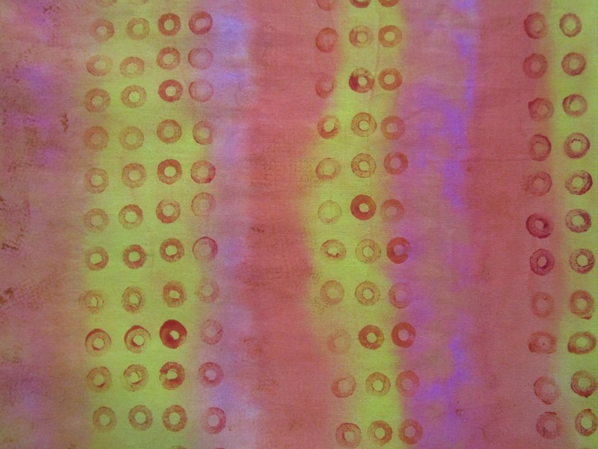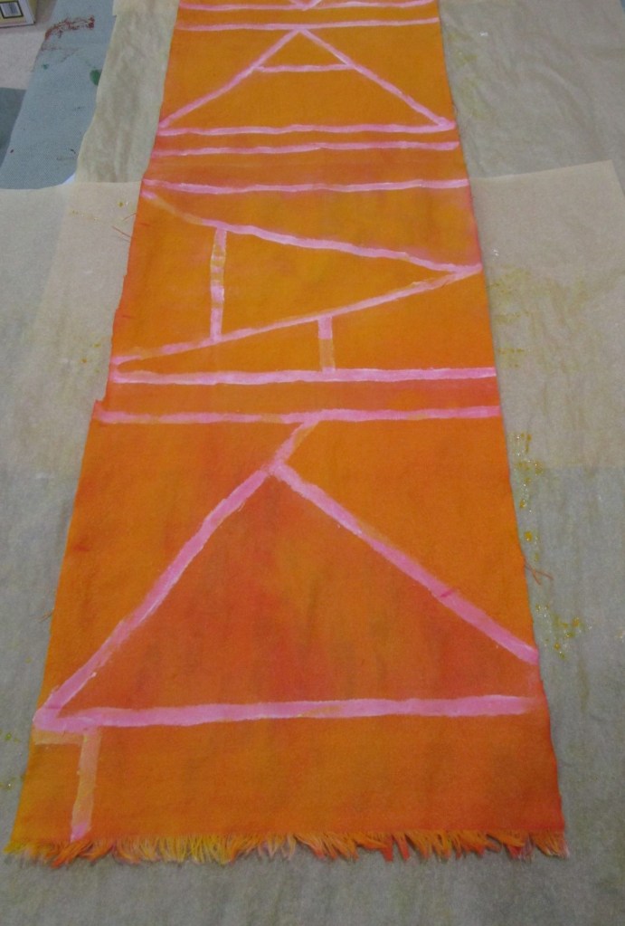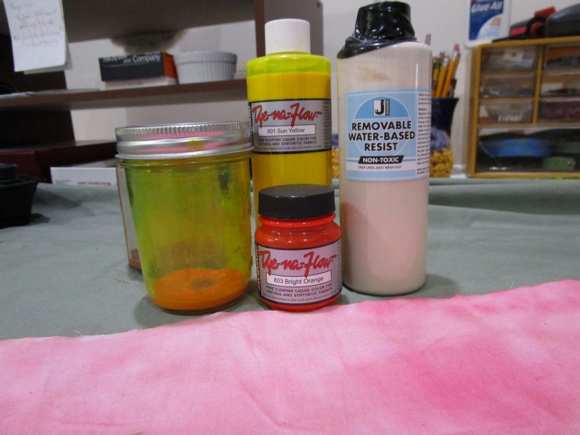 Today I will be enhancing the fabrics I color washed yesterday with more color. I’m excited to try water-based resist, a product new to me. I will be using it on the pale pink strip of fabric, also pictured, above.