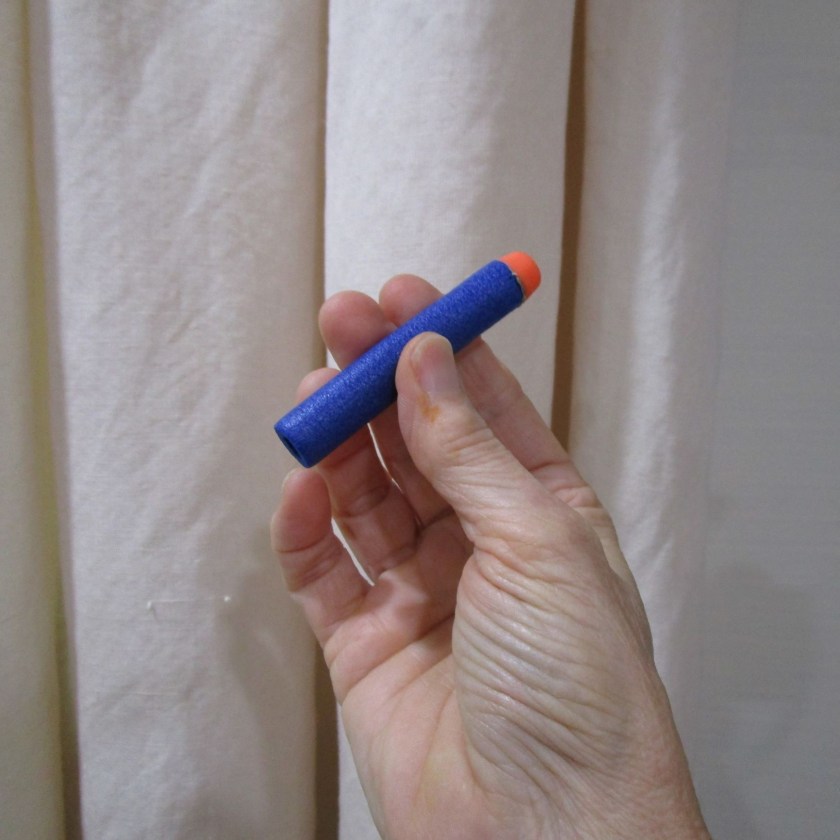 Any one who is related to a son or a grandson will recognize a foam nerf bullet. I will be printing with the back end of the bullet, which makes a very nice circle. Here is the fabric before and after printing with orange Jacquard Textile paint.