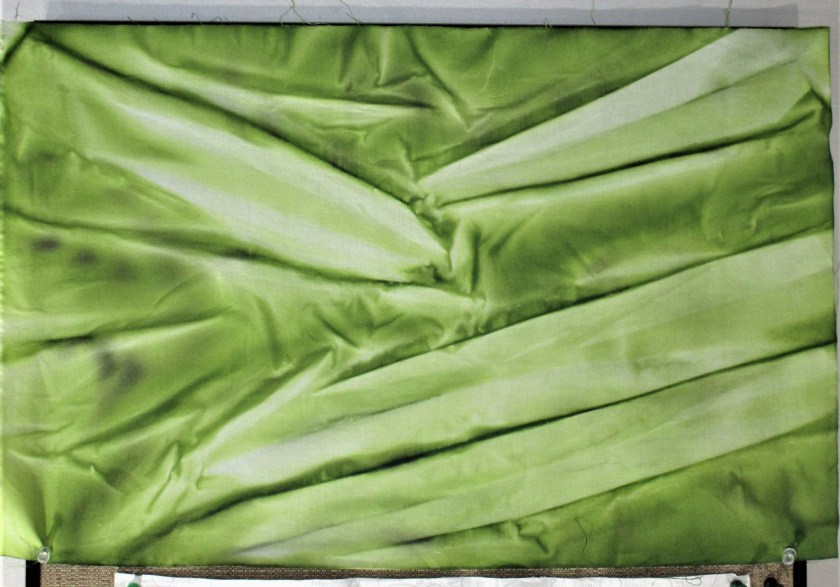 Here is a recap of how I processed this inspiration. First of all, I used fabric paint and the Shibori technique to render the background on cotton fabric.