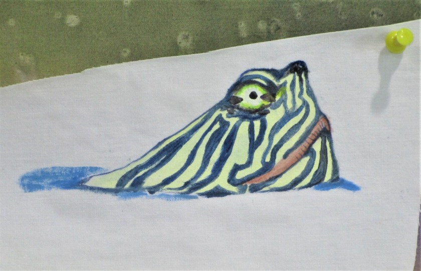 It took a lot of pondering and a dose of courage to add the turtle’s reflection. The only real option was to hand paint it using opaque Setacolor. So I did.