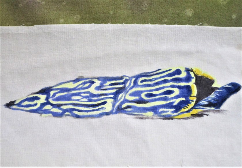 After the paint dried, I added another layer to render some shadows. Next I painted the two halves of the turtle onto white fabric…….