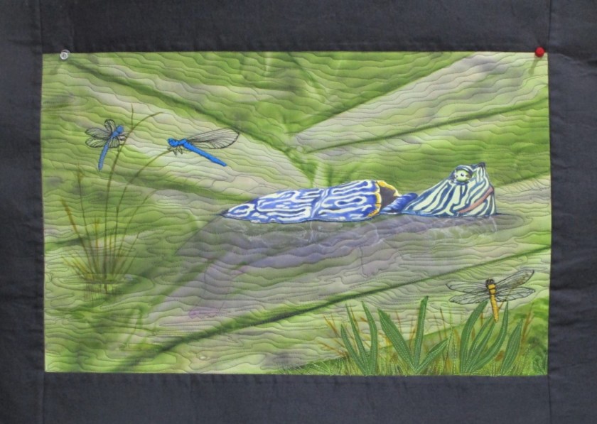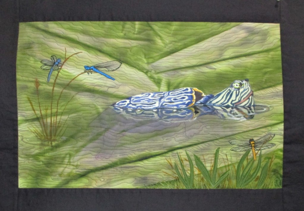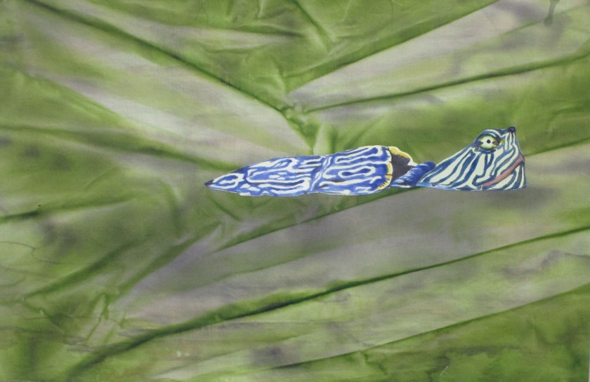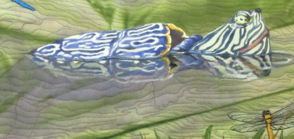 It’s been a while since I shared the turtle in the pond fiber object. As a reminder, it was inspired by a photo taken by Bill on a recent camping trip at Lake Montgomery.