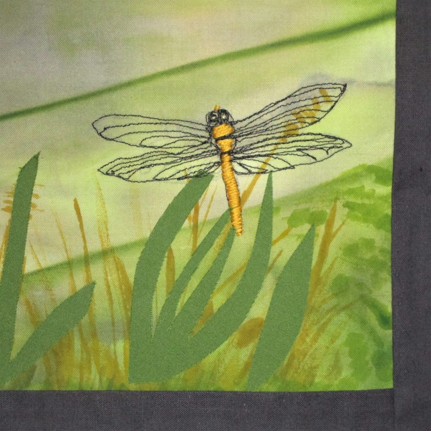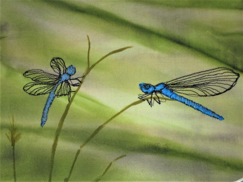 I decided on a few damselflies. More images by Bill were consulted. I picked three beauties, hand embroidered the bodies with floss and machine stitched the wings.