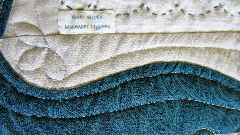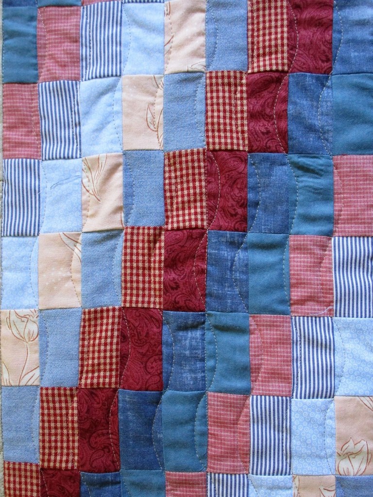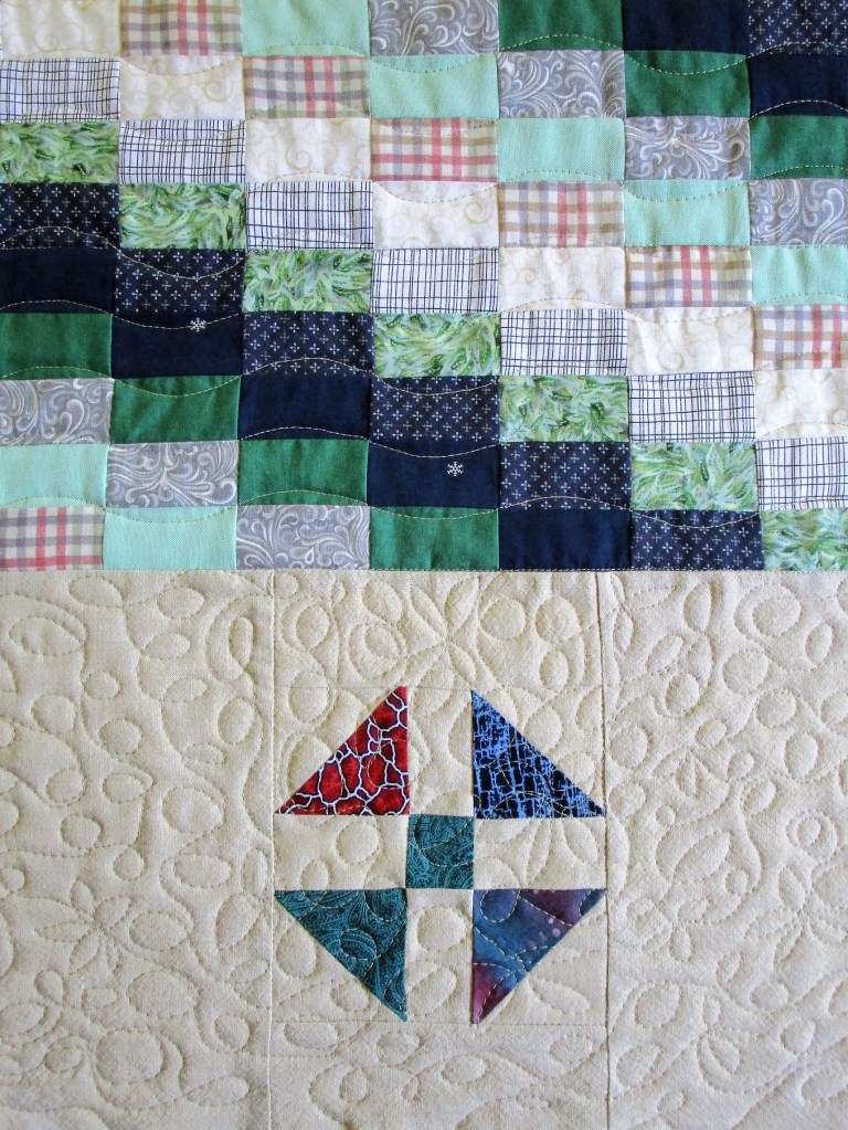 After getting the blocks sewn together, I quilted the sections in a dark blue thread. I was proud that my free-motion quilting skills were proficient enough to make swirls, wiggles, spirals, shapes and lettering.
