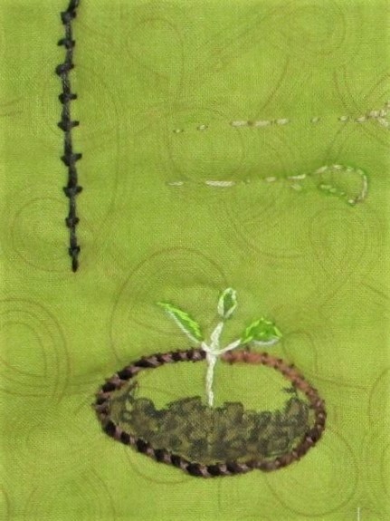 Black line is coral stitch. The seedling is growing from a pot outlined in couched yarn and cross stitched. The leaves are chain stitches and stem stitch. I used paint and fabric marker to add the color.