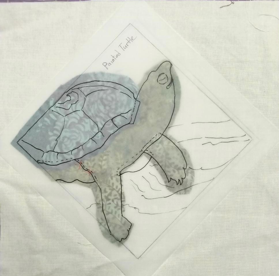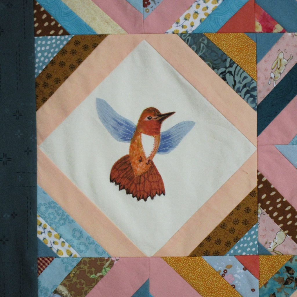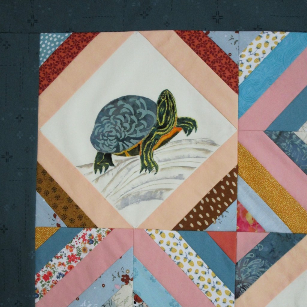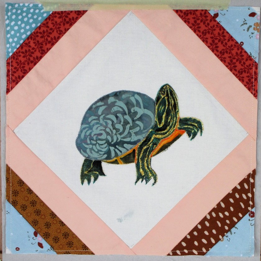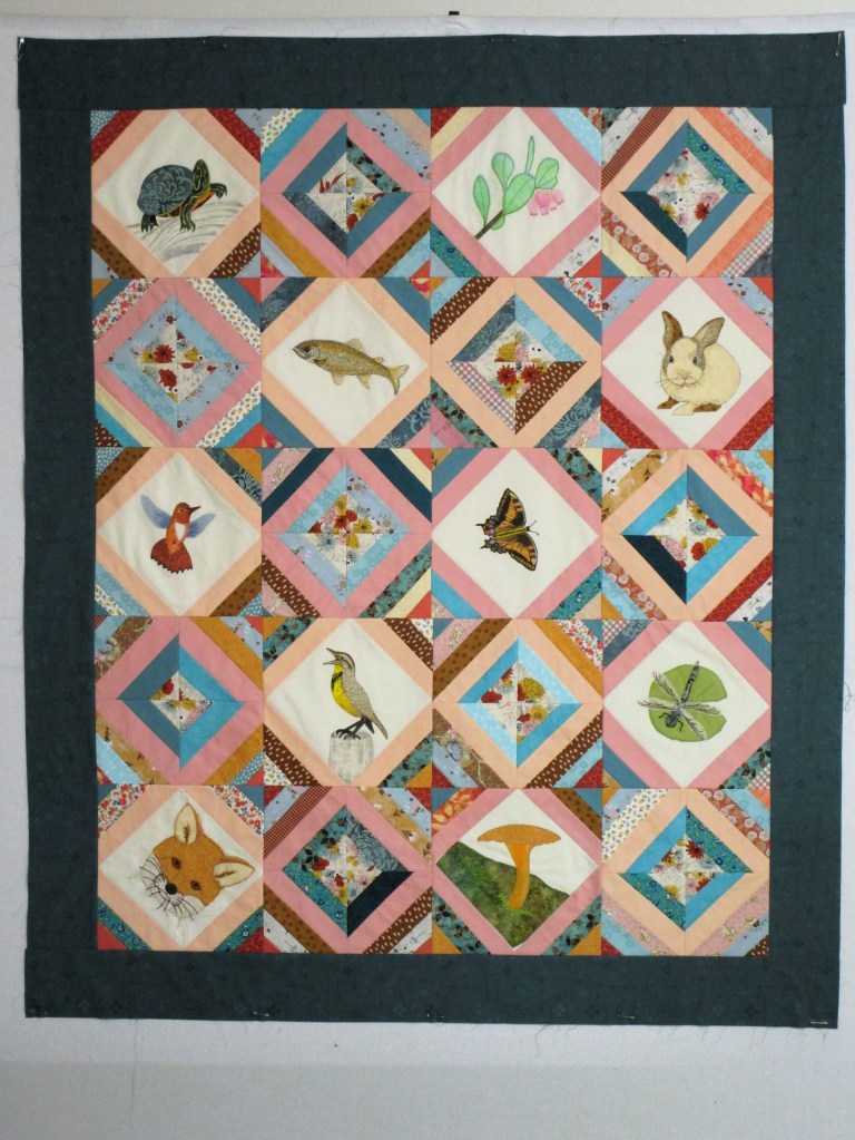This quilt is made in strip-piece fashion and finished out at 48 x 58. I’m pretty happy with the result. Using fabrics (mostly from Connecting Threads) that match (or approximate) the color palette provided by the new mom, I organized the quilt around ten applique blocks with images of creatures and plants that live in the baby’s home state. My daughter assisted me in designing and sewing these feature blocks.