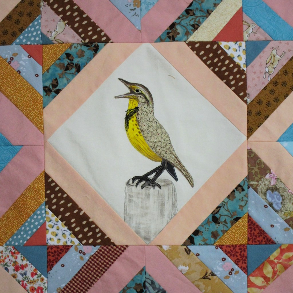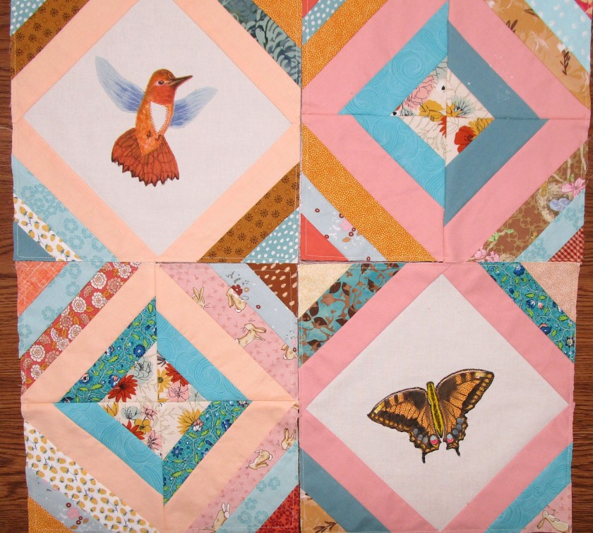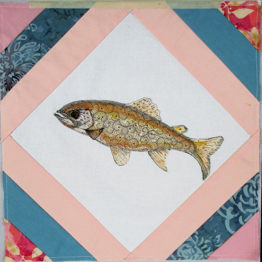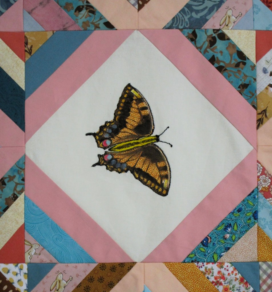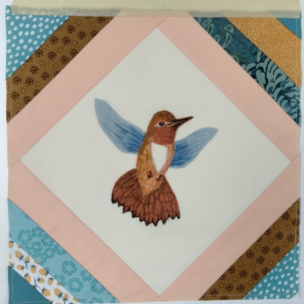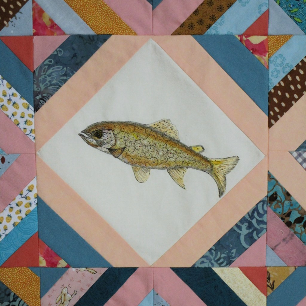 This quilt is made in strip-piece fashion and finished out at 48 x 58. I’m pretty happy with the result. Using fabrics (mostly from Connecting Threads) that match (or approximate) the color palette provided by the new mom, I organized the quilt around ten applique blocks with images of creatures and plants that live in the baby’s home state. My daughter assisted me in designing and sewing these feature blocks.