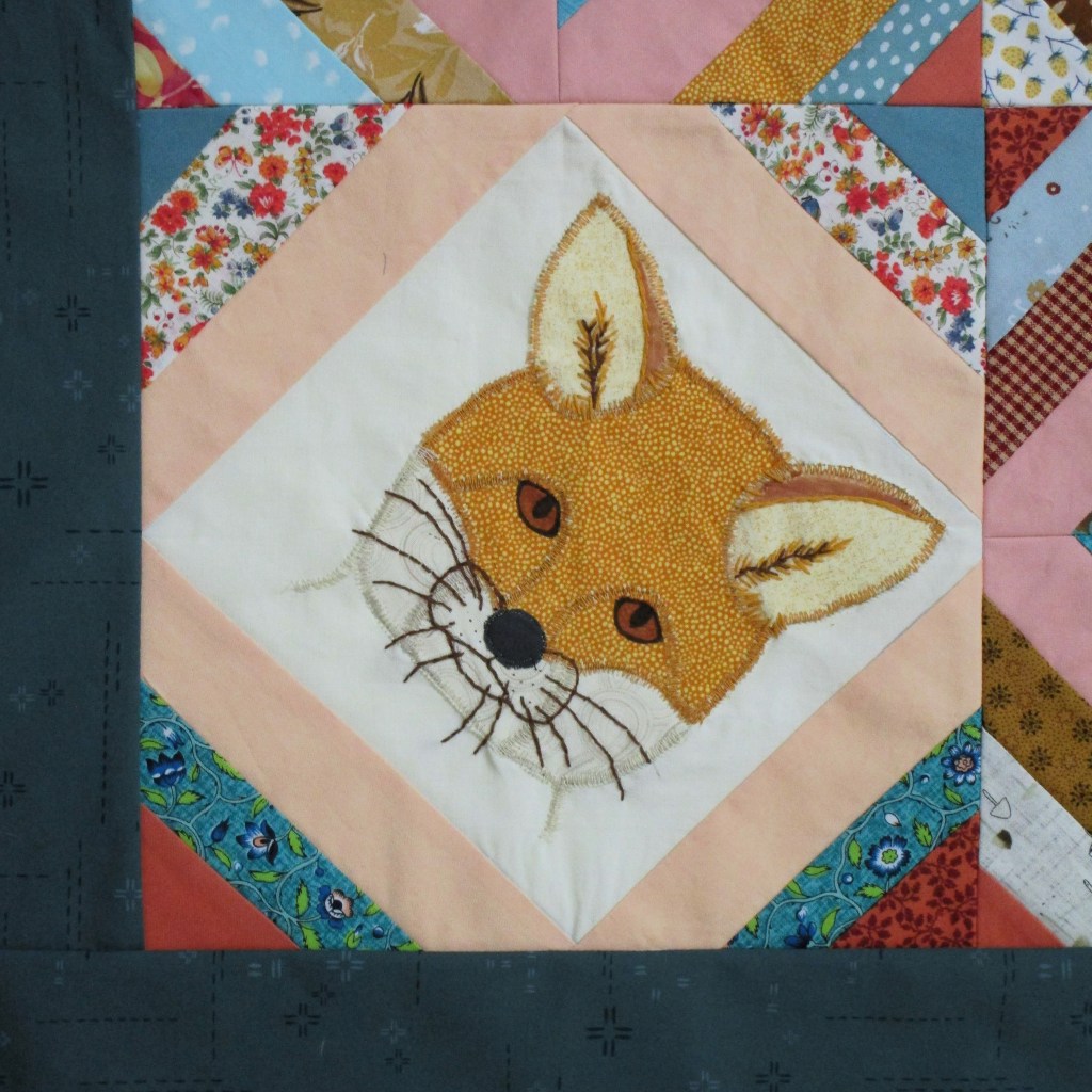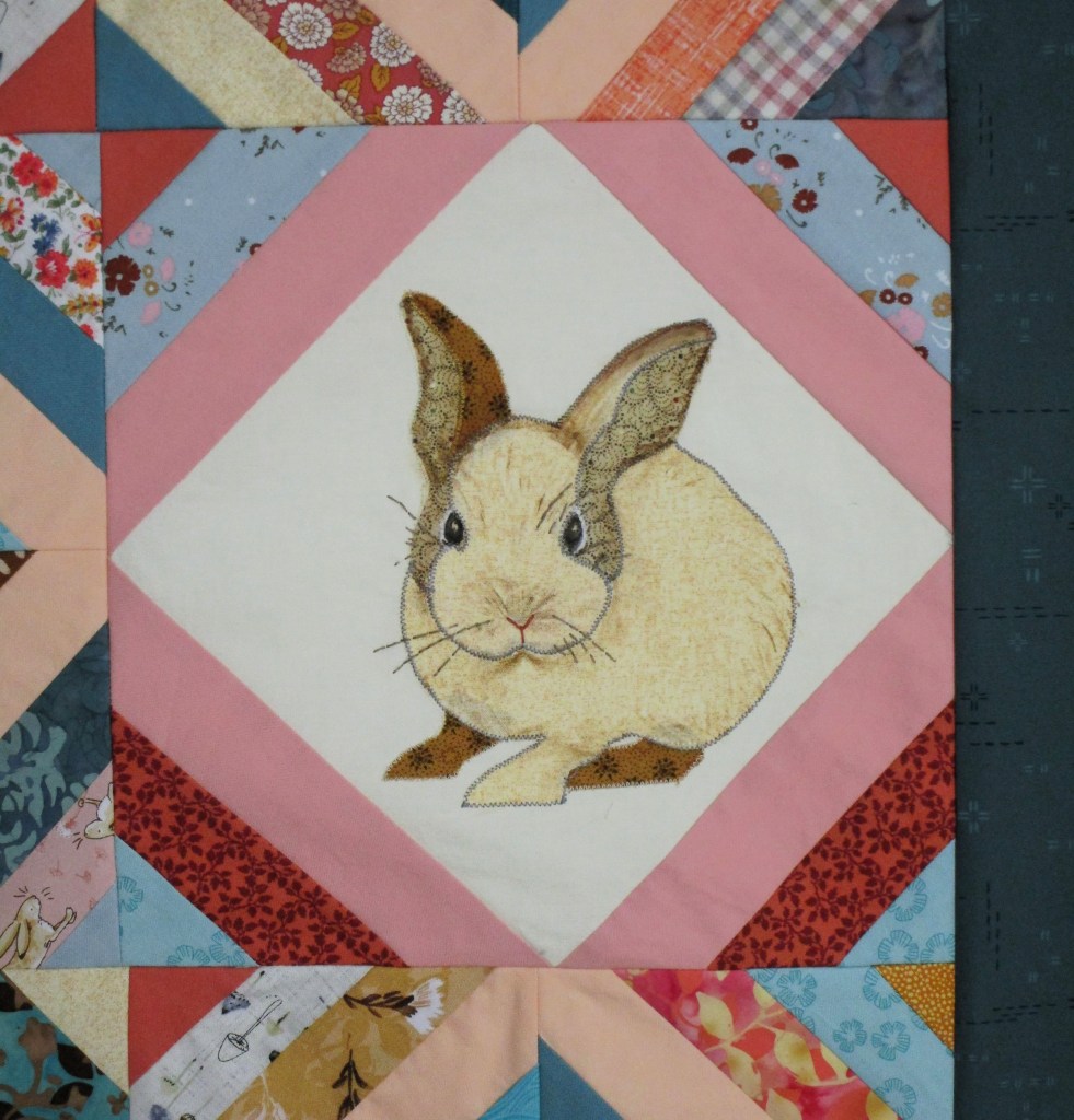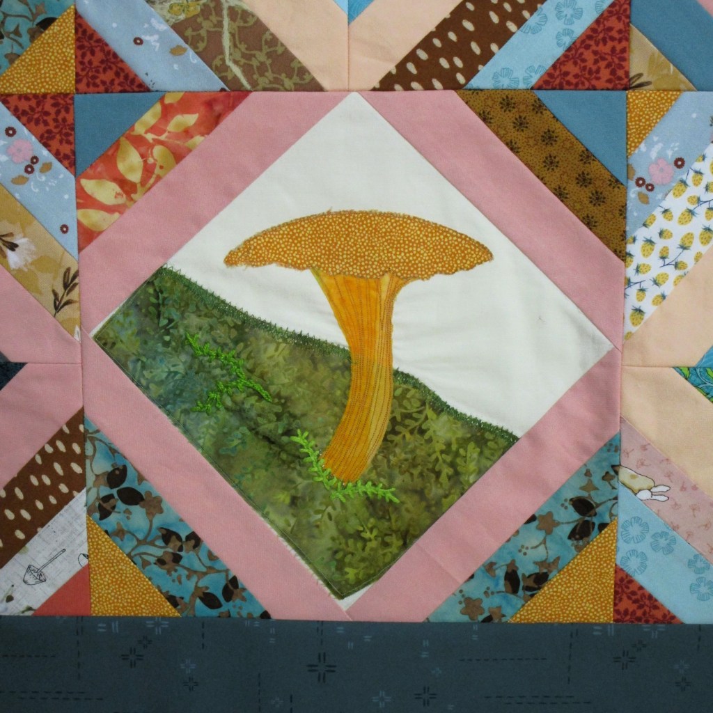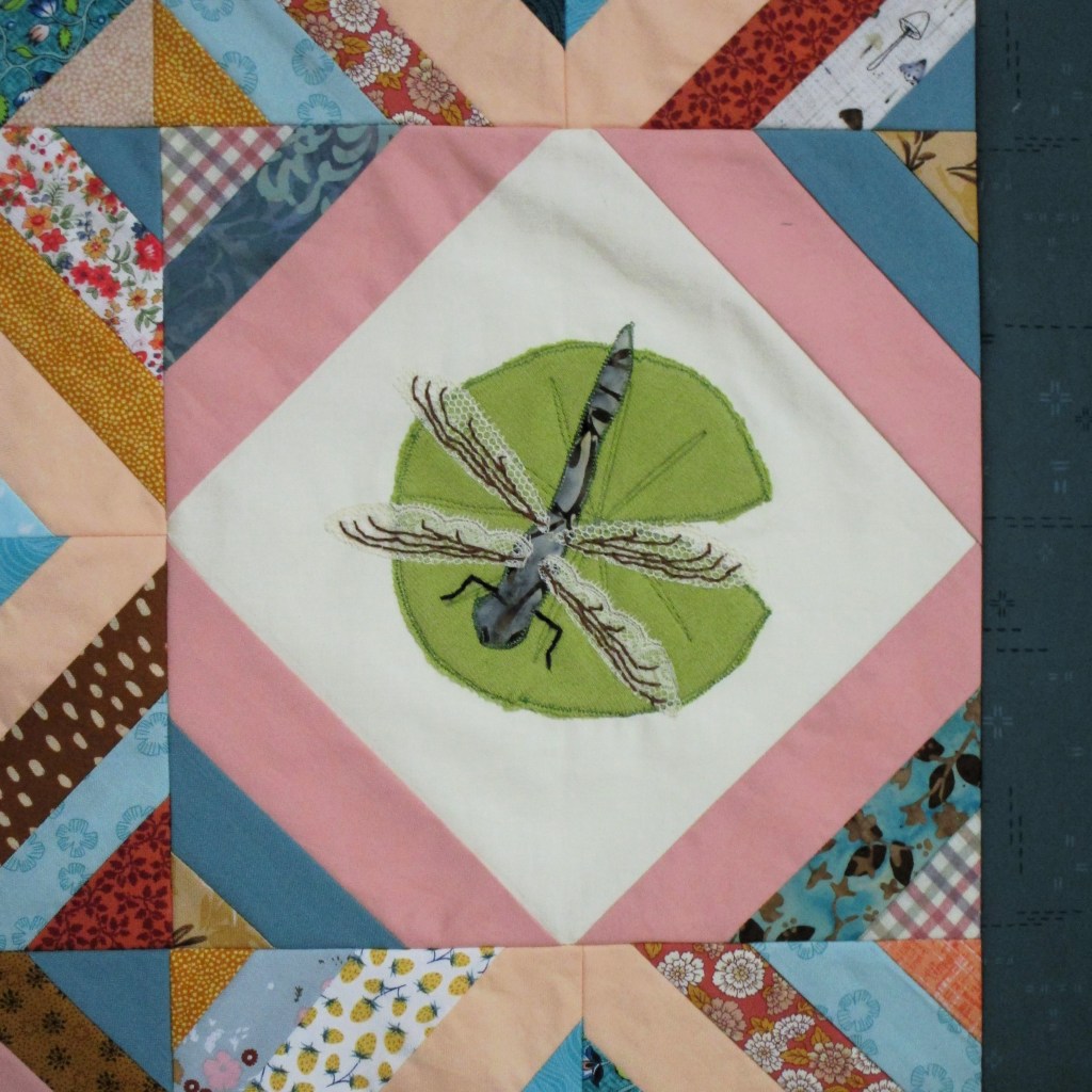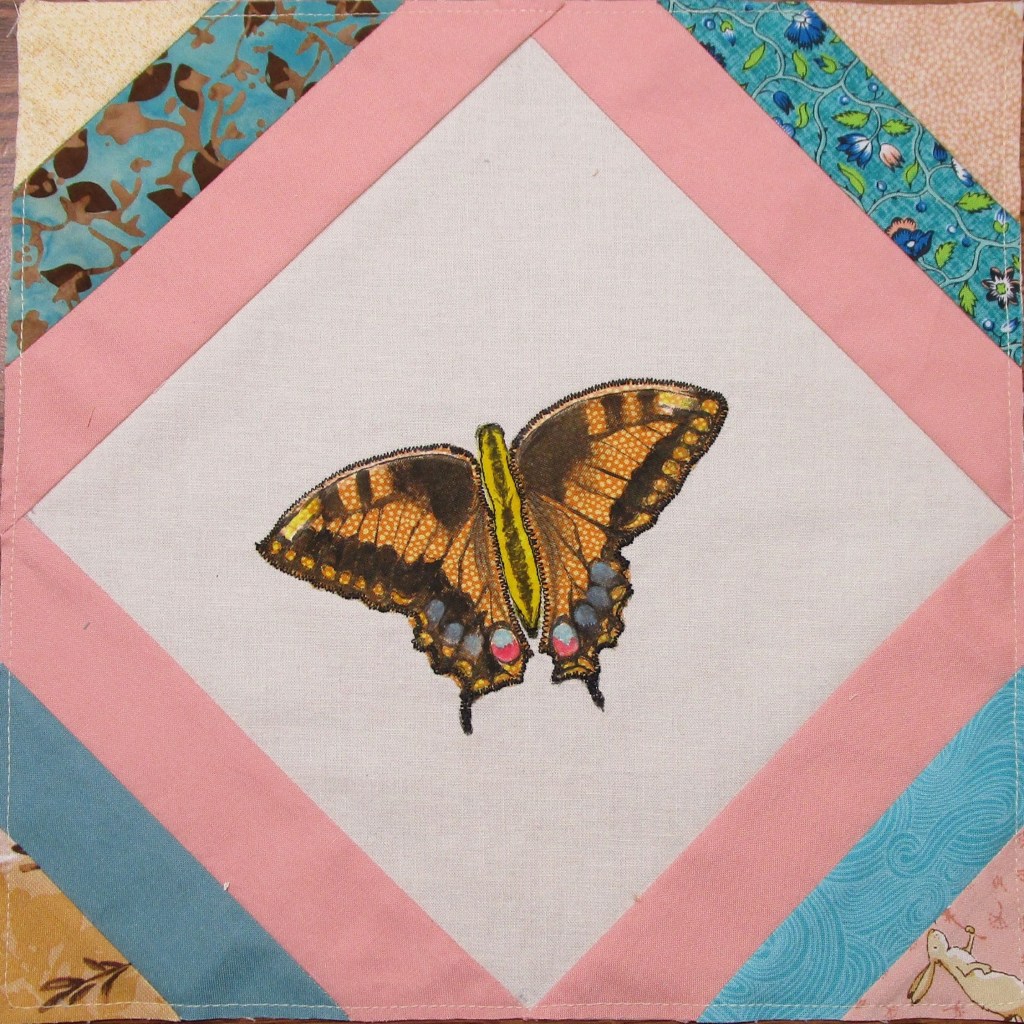 This quilt is made in strip-piece fashion and finished out at 48 x 58. I’m pretty happy with the result. Using fabrics (mostly from Connecting Threads) that match (or approximate) the color palette provided by the new mom, I organized the quilt around ten applique blocks with images of creatures and plants that live in the baby’s home state. My daughter assisted me in designing and sewing these feature blocks.