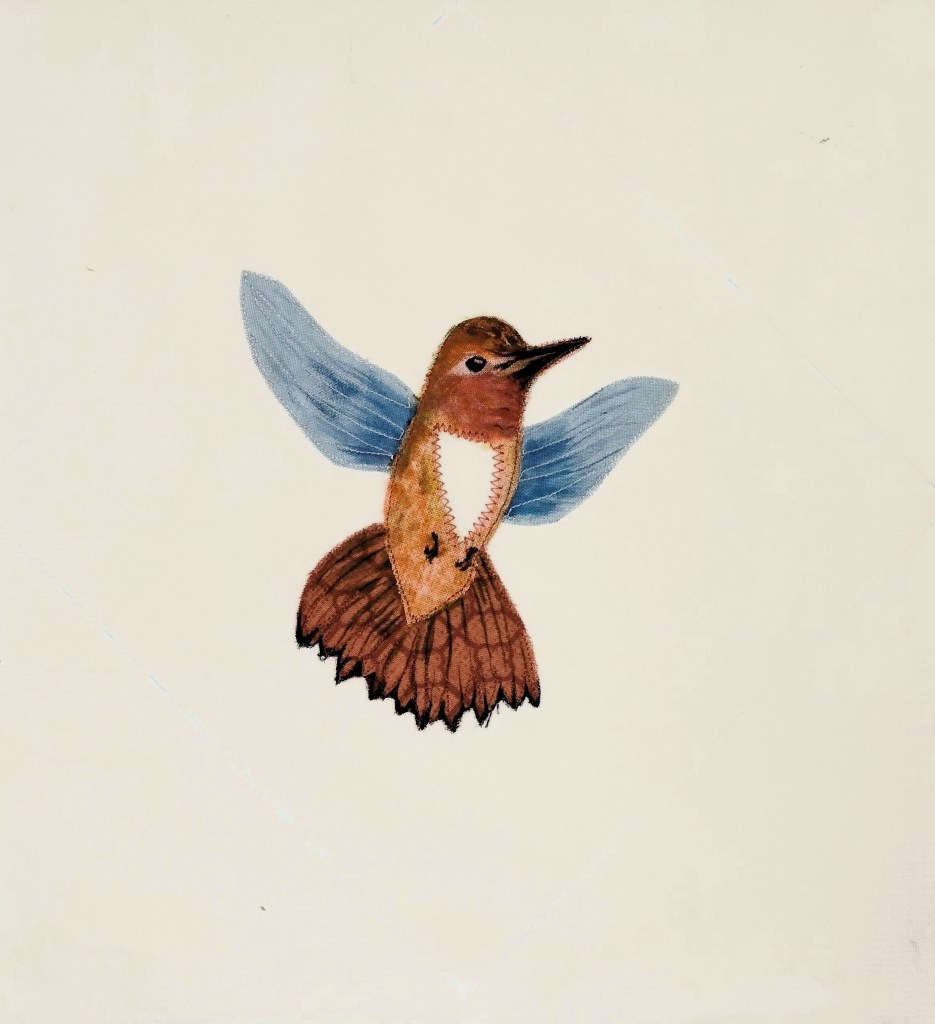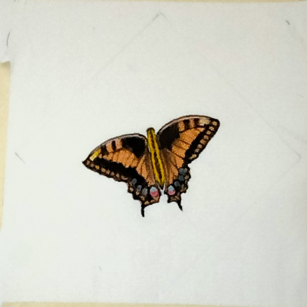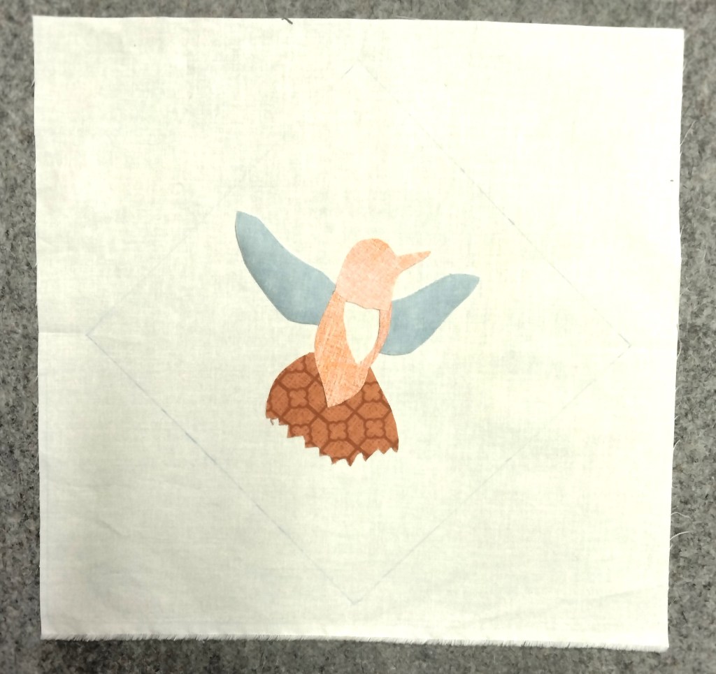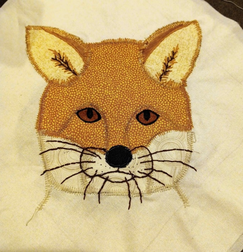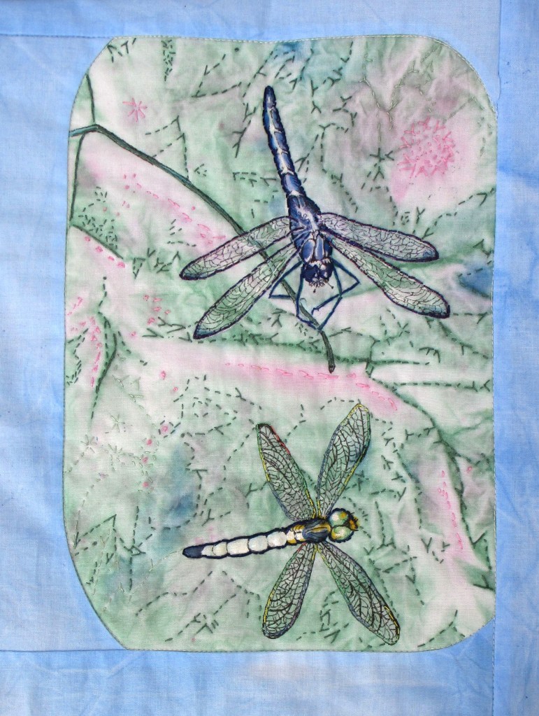 This quilt is made in strip-piece fashion and finished out at 48 x 58. I’m pretty happy with the result. Using fabrics (mostly from Connecting Threads) that match (or approximate) the color palette provided by the new mom, I organized the quilt around ten applique blocks with images of creatures and plants that live in the baby’s home state. My daughter assisted me in designing and sewing these feature blocks.