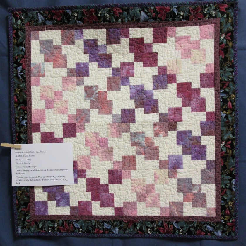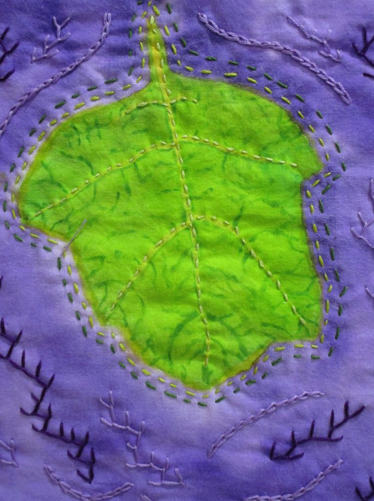 Fabric selection included bits of three men’s shirts. (The dark red and dark green strips, and the blue chambray behind the first circle.) All three of these fabrics had been worked into the Shell Lake Story quilt. So, I am using scraps of scraps!